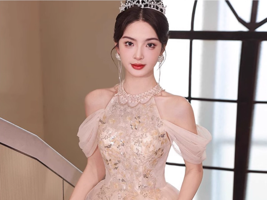 Off-Shoulder Ruffles Tulle Splicing Socialite Feast Sequins Glow Host Halter Prom Dress AP0653