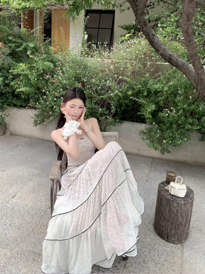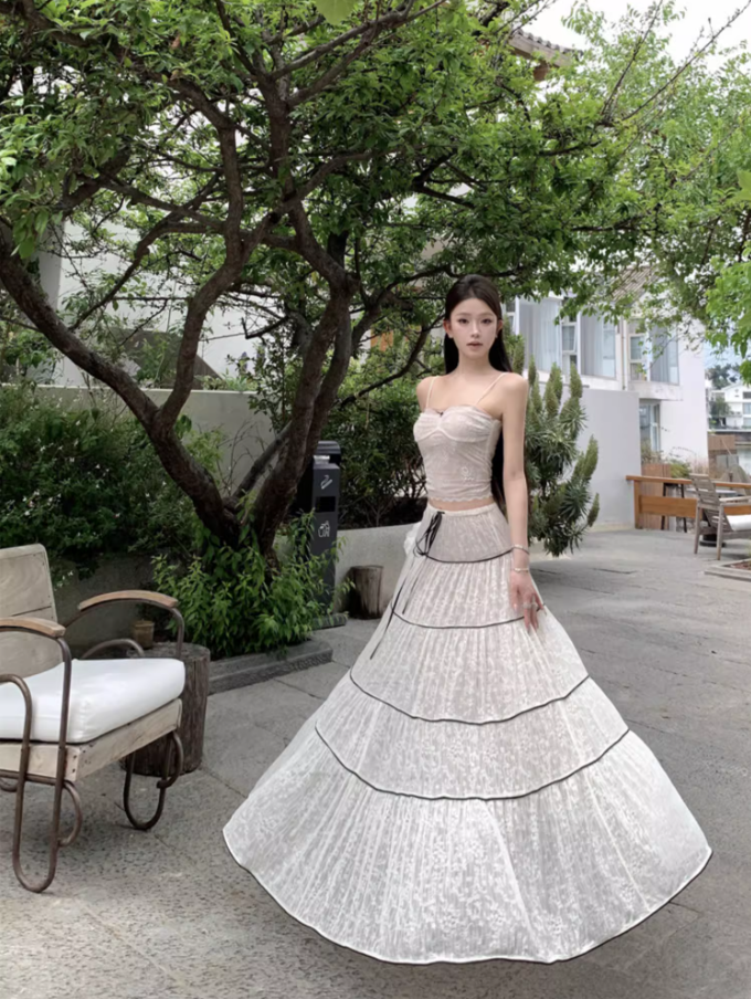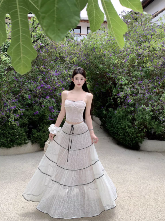 Ornate 2-Piece Set Spaghetti Strap A-Line Maxi Dress Dreamy Stripes Lace Jacquard Long Dress AP3378