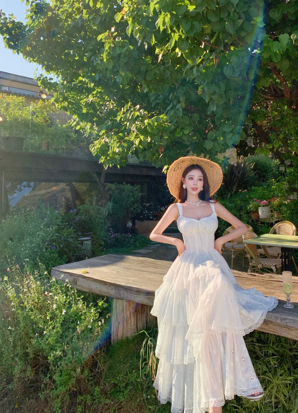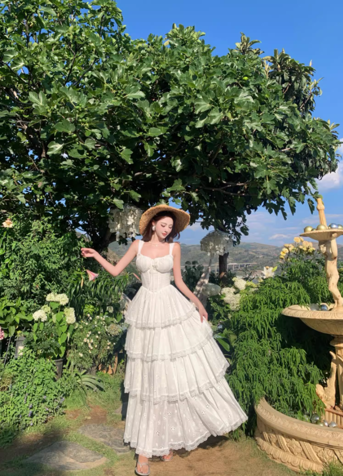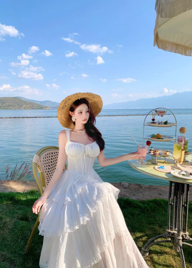 Ethereal White Spaghetti Strap A-Line Maxi Dress Elegant Tiered Cutout Hem Vacation Outfit Long Dress AP3323