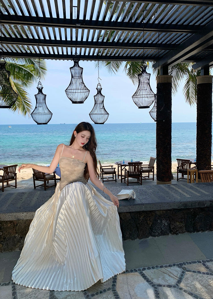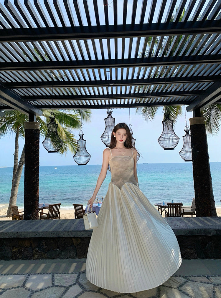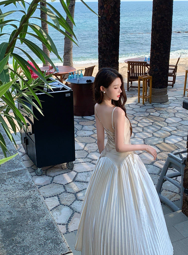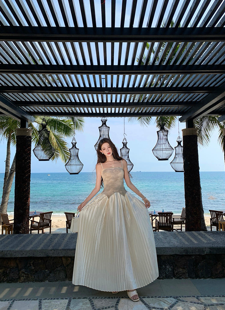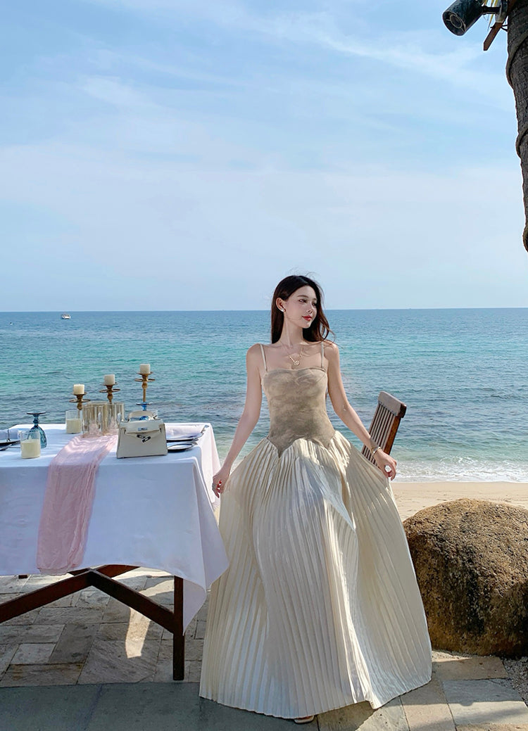 Luxury Spaghetti Strap A-Line Tie-Dye Maxi Dress Pretty Press Pleated Hem Long Dress AP3339