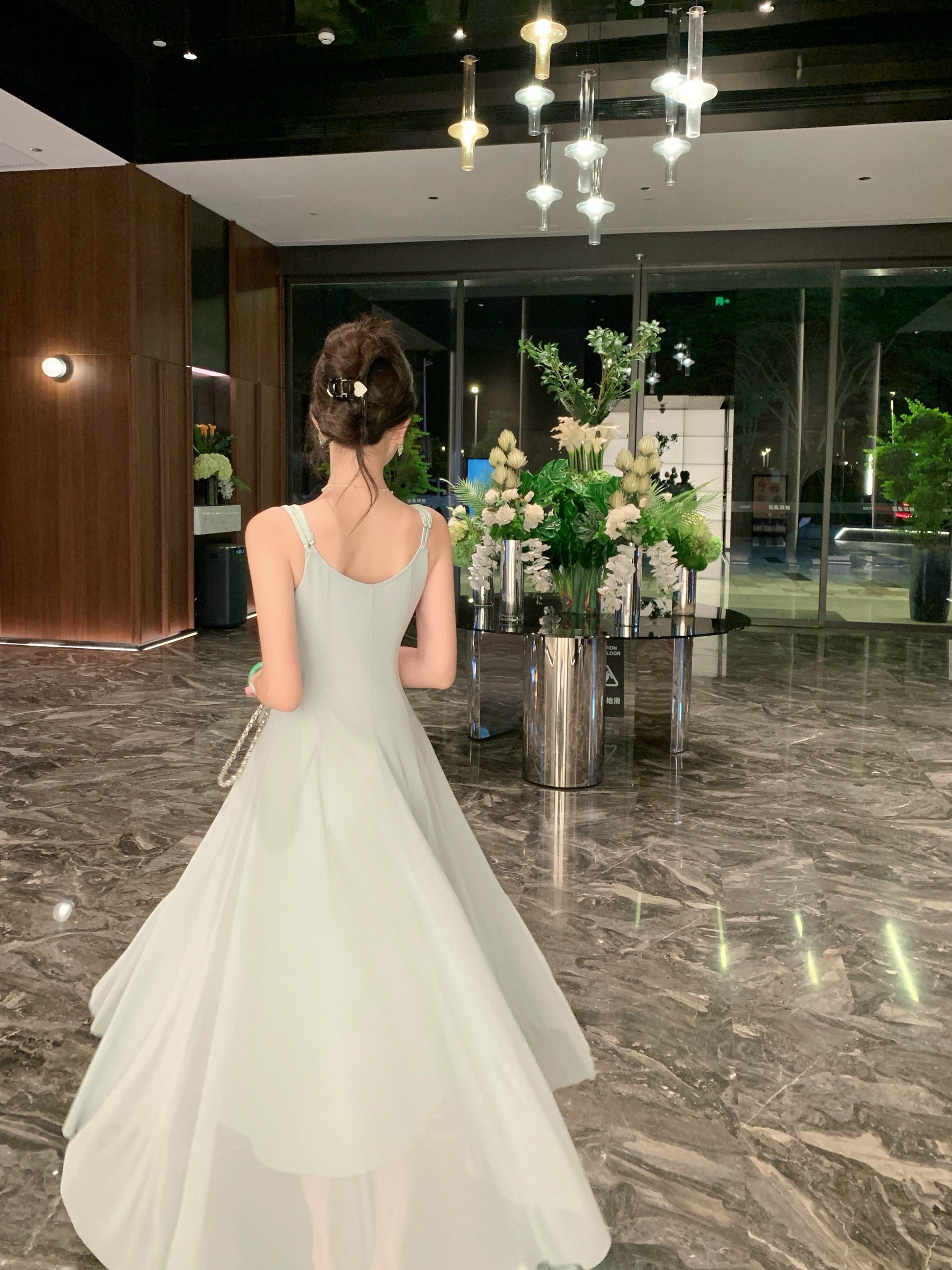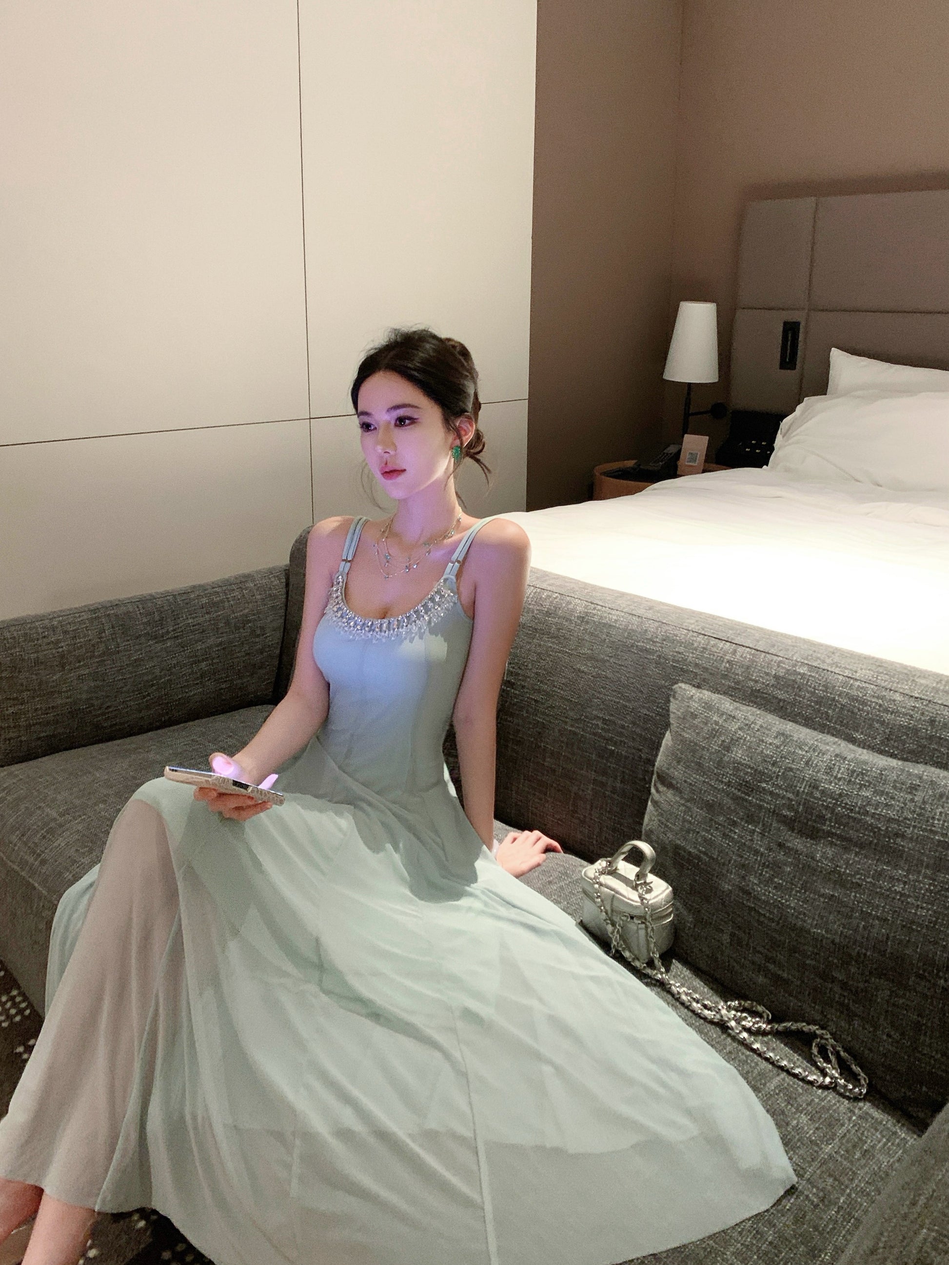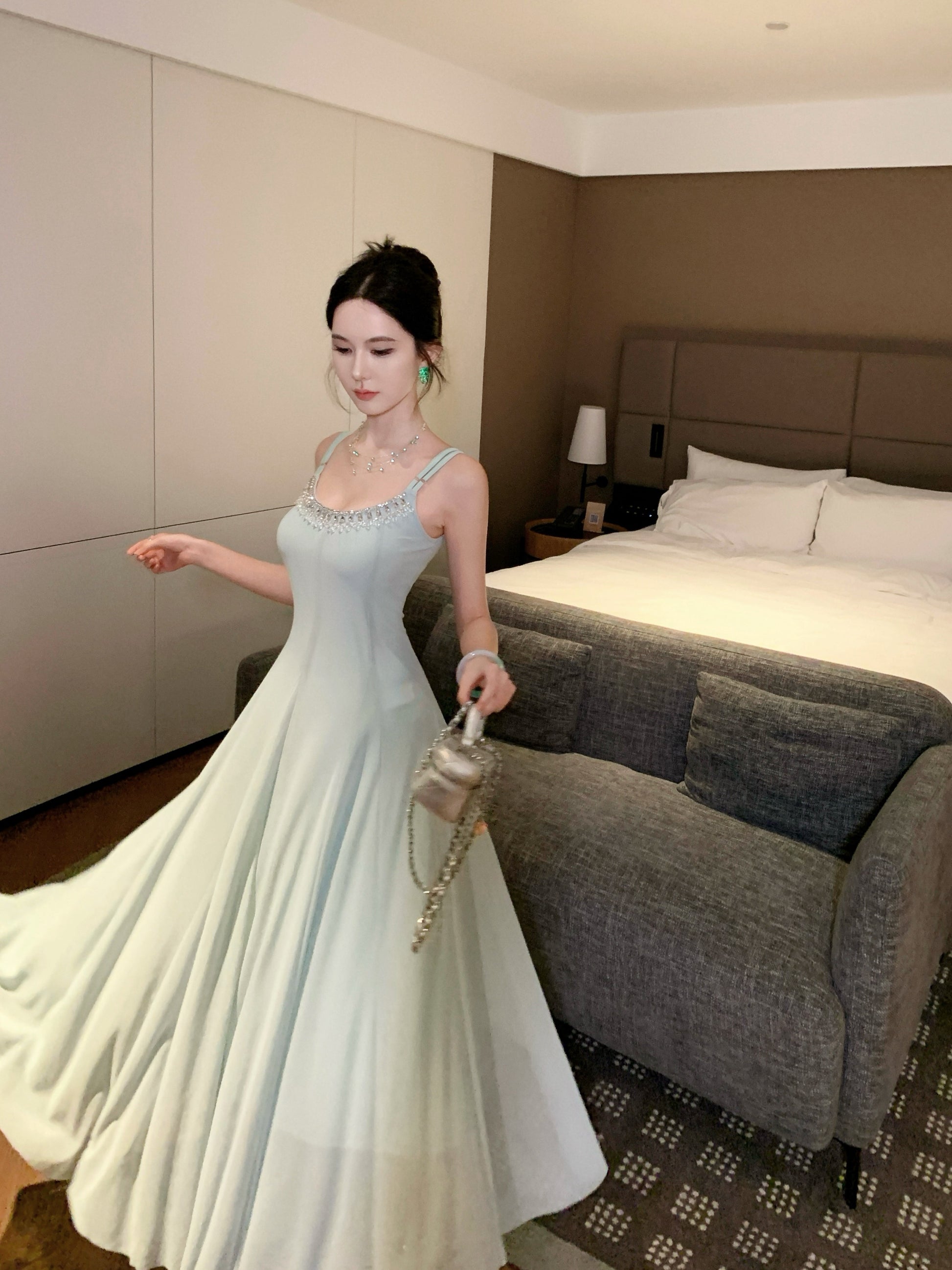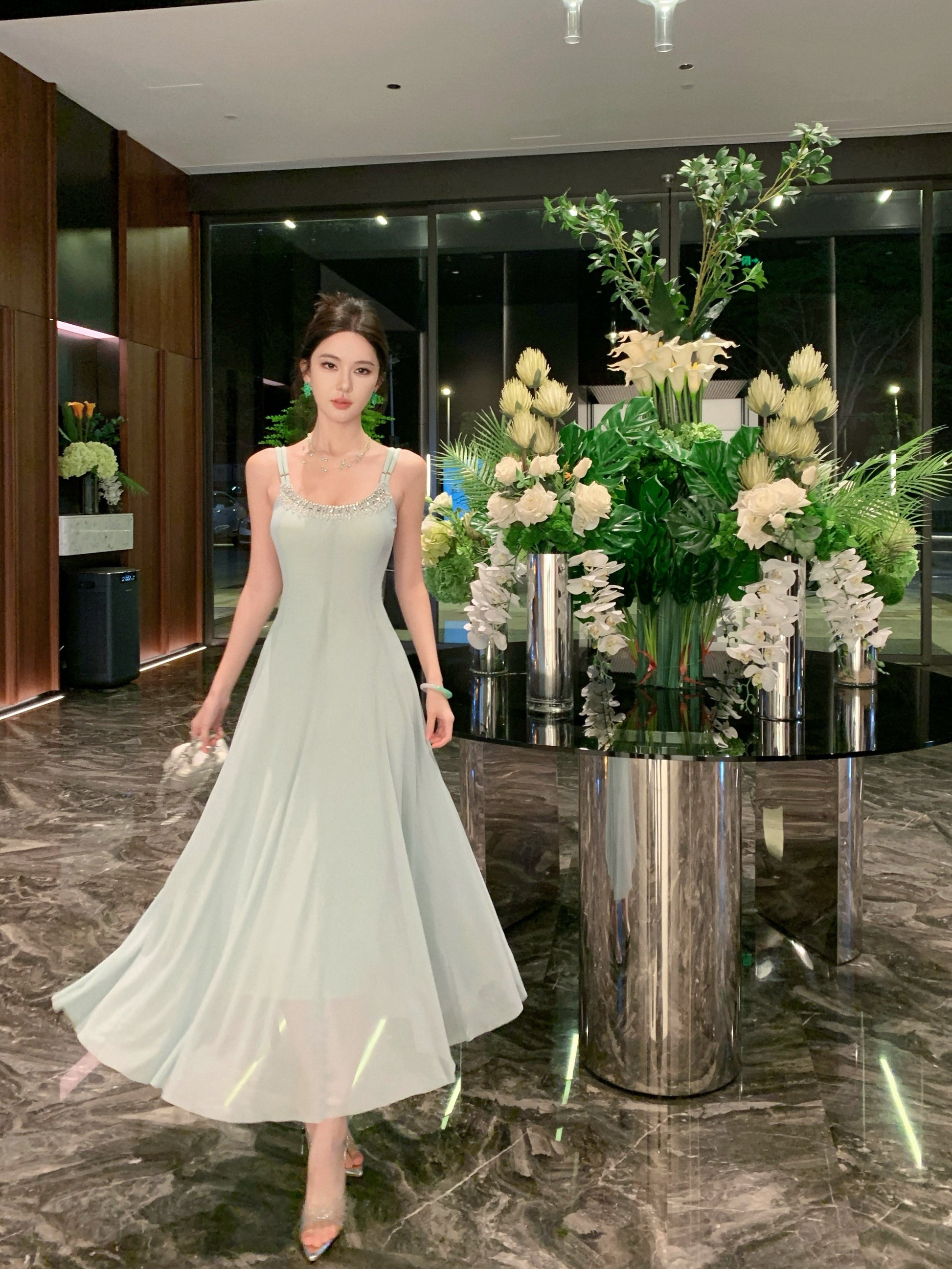 Dreamy Spaghetti Strap A-Line Crystals Accent Maxi Dress Stylish Cinched Waist Long Dress AP3348