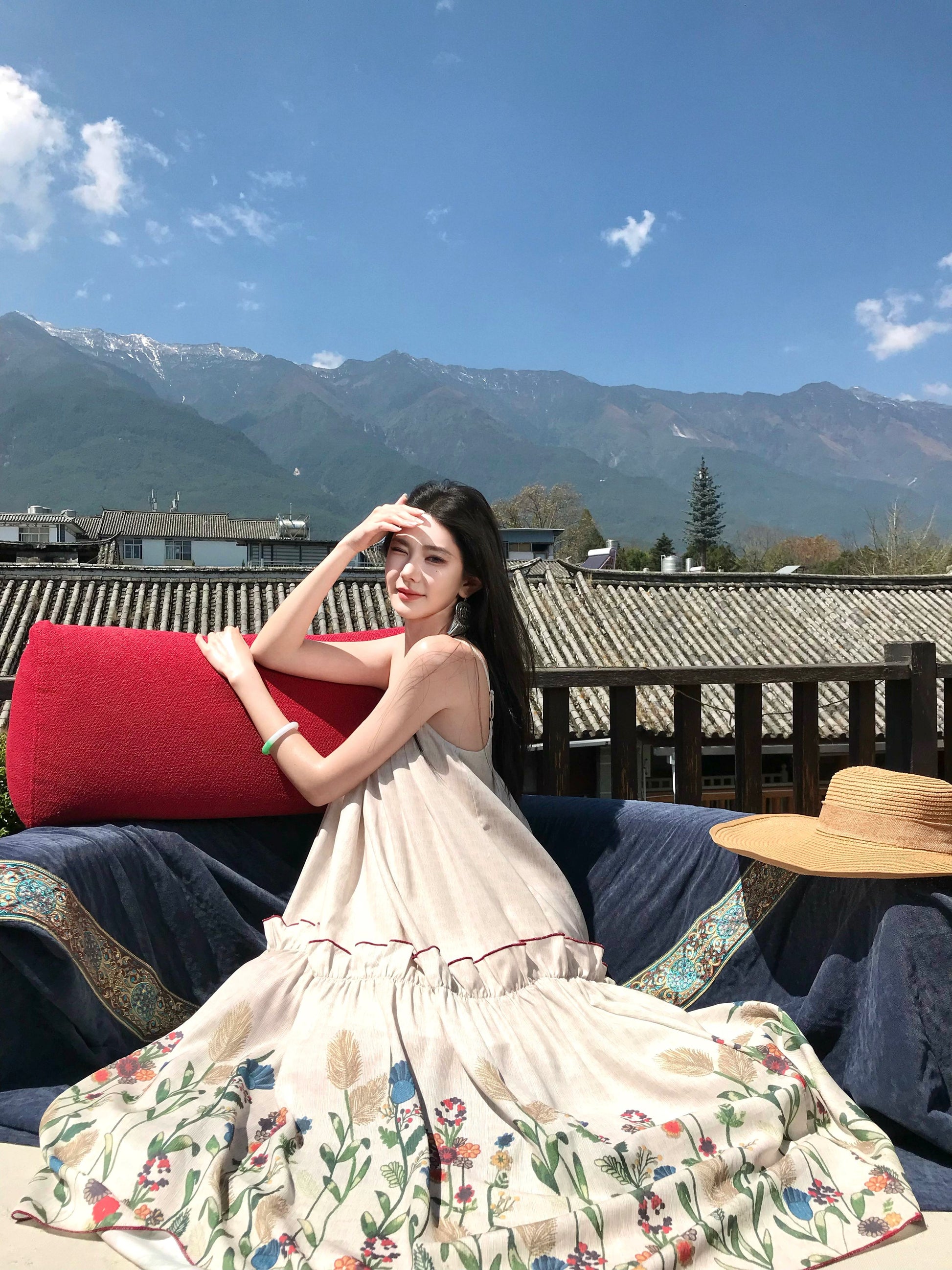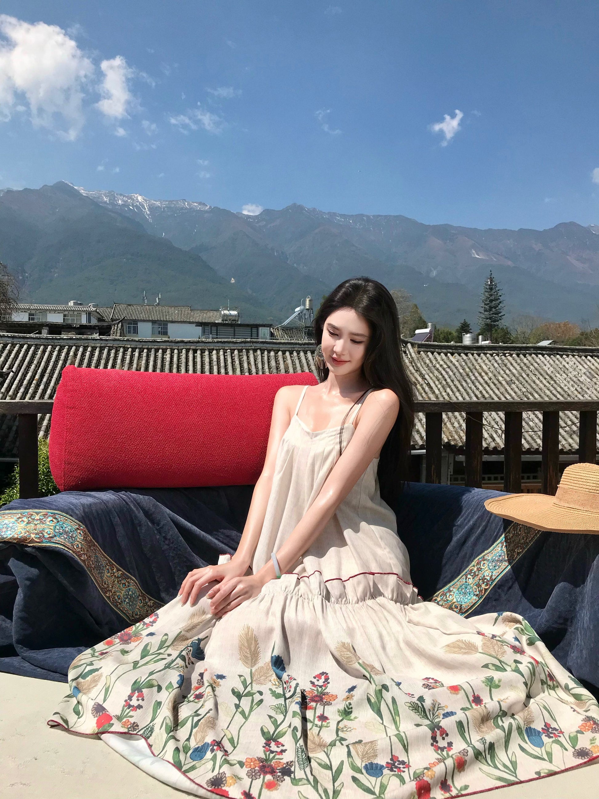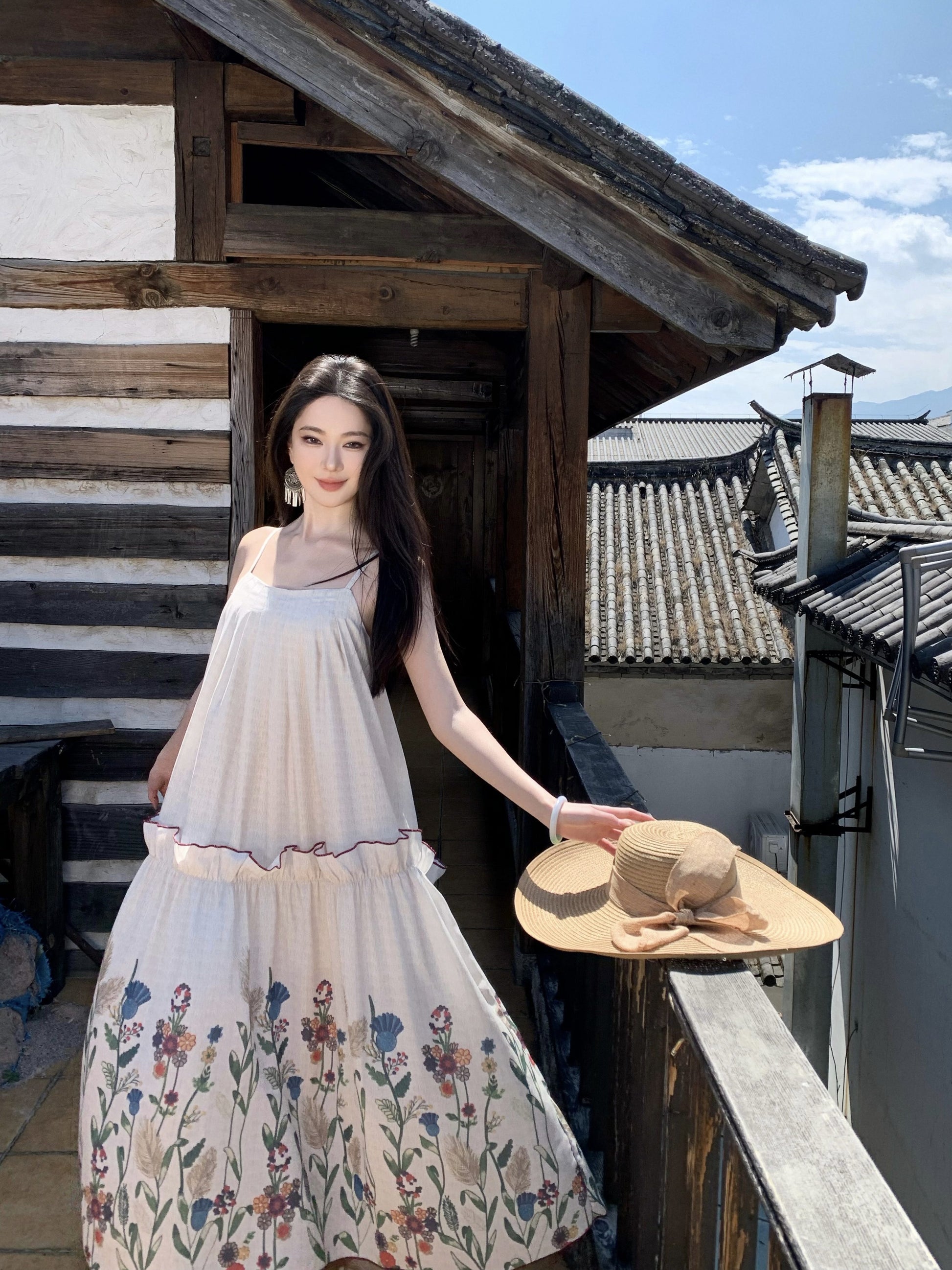 Graceful Spaghetti Strap A-Line Maxi Dress Boho-Inspired Ruffles Floral Print Loose Fit Long Dress AP3372