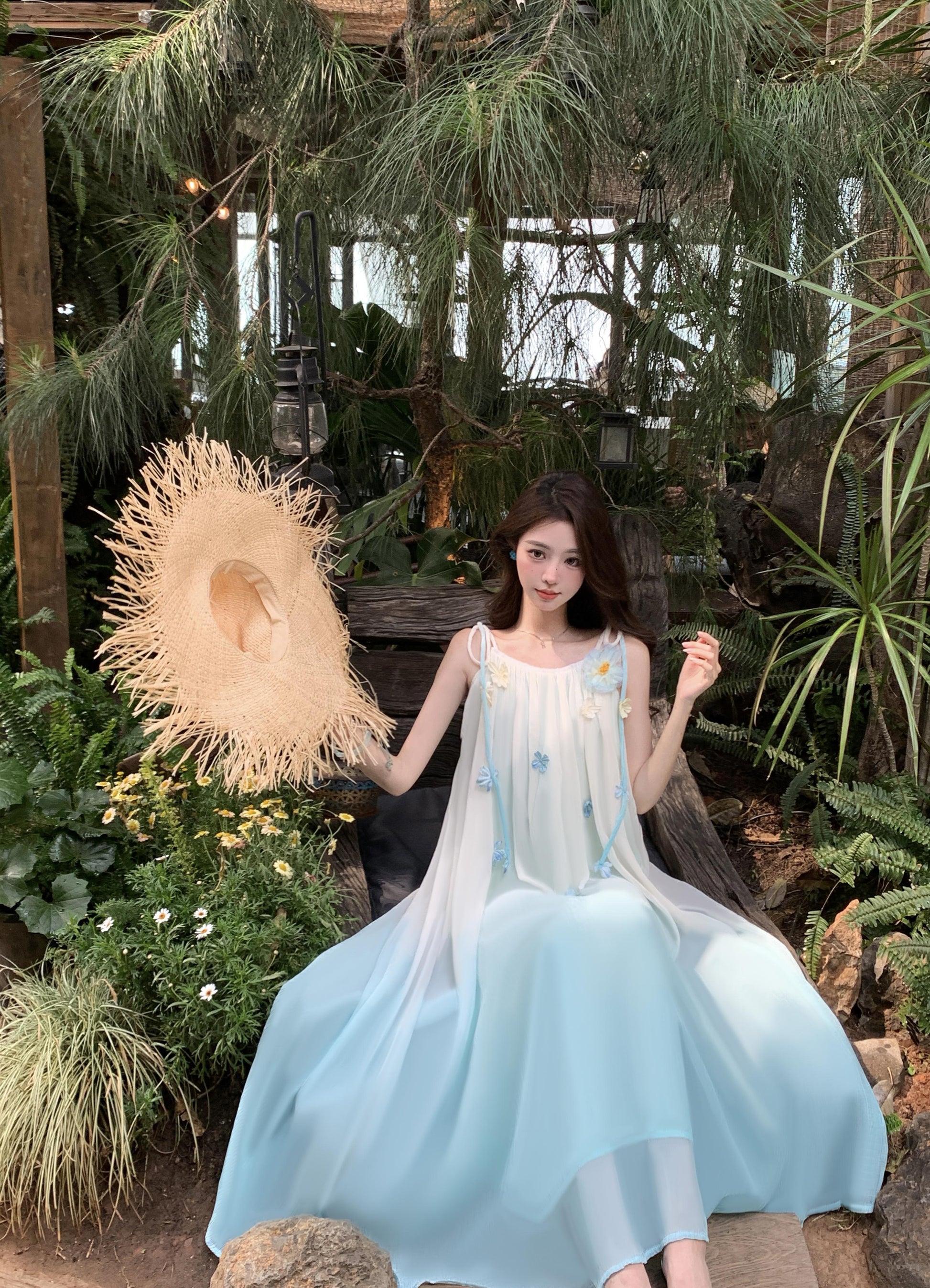 Delicate Floral Accent Spaghetti Strap A-Line Maxi Dress Fancy Flowy Loose Fit Ombre Long Dress AP3384