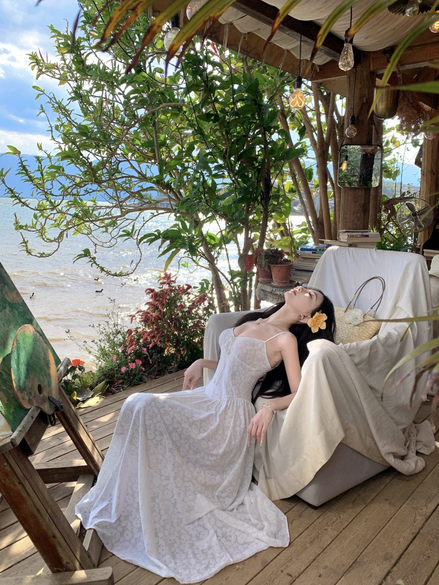 Flowy Spaghetti Strap White A-Line Maxi Dress Enticing Lace Jacquard Long Dress AP3396