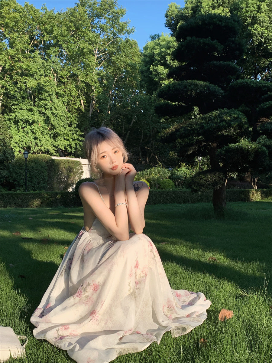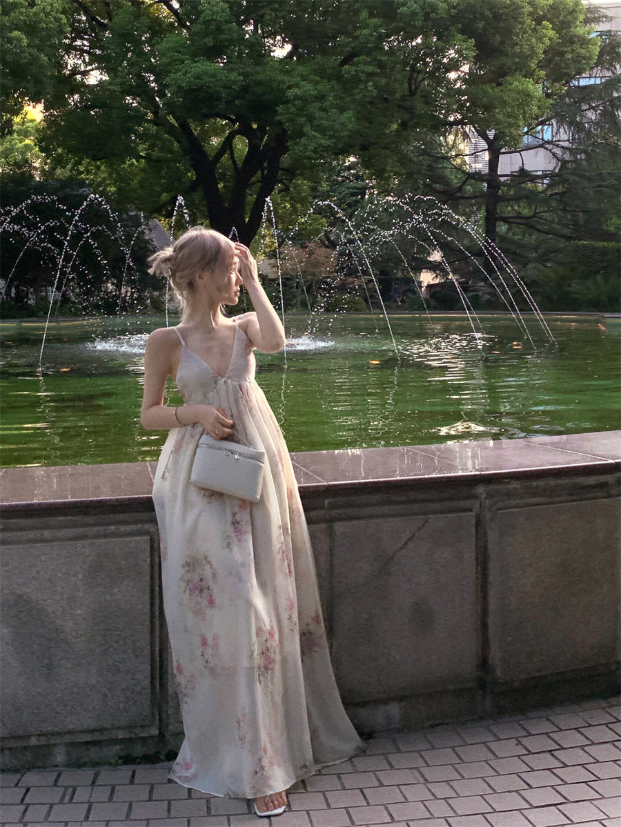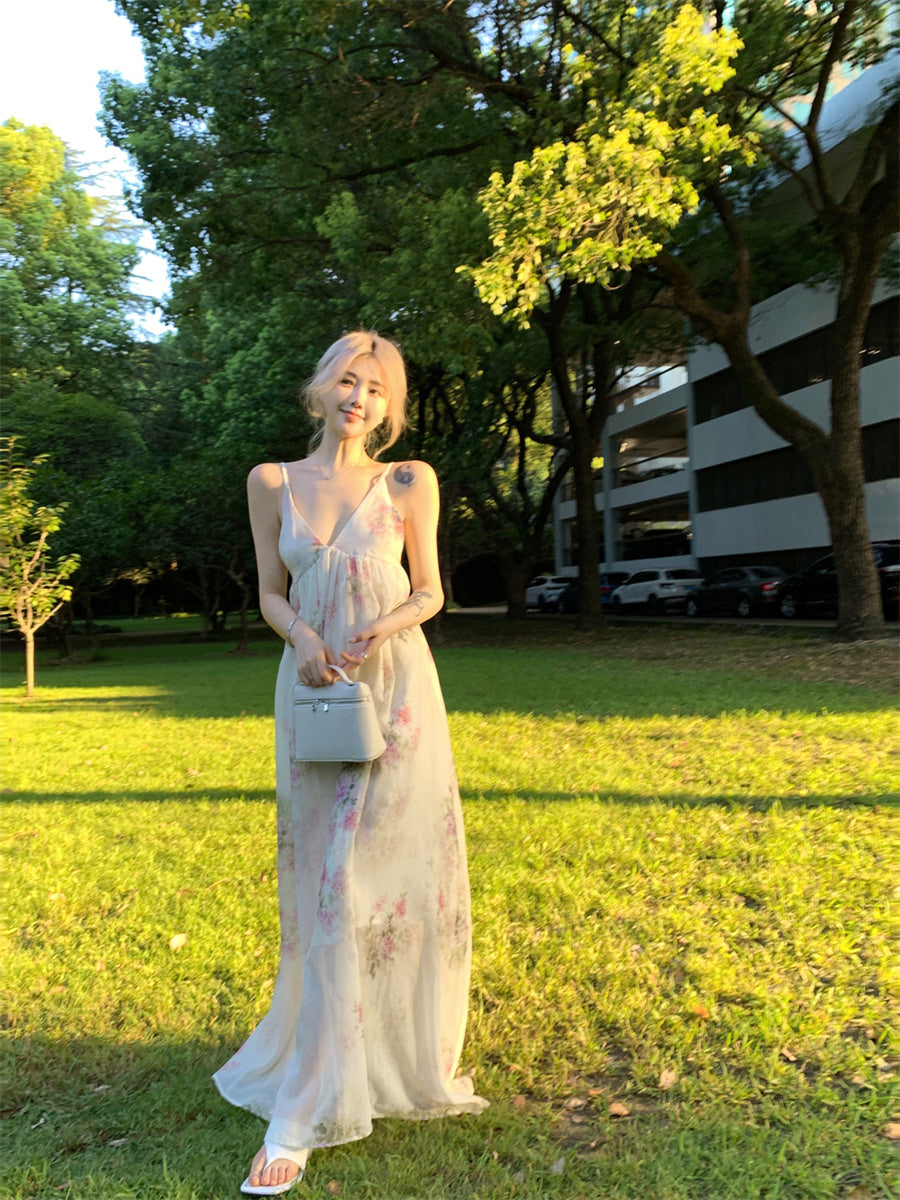 Wonderful Spaghetti Strap Everyday Wear Floral Print A-Line Maxi Dress Chic Backless Cinched-Waist Flowy Hem Long Dress AP3465