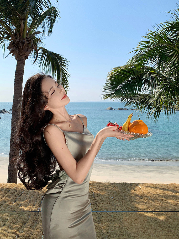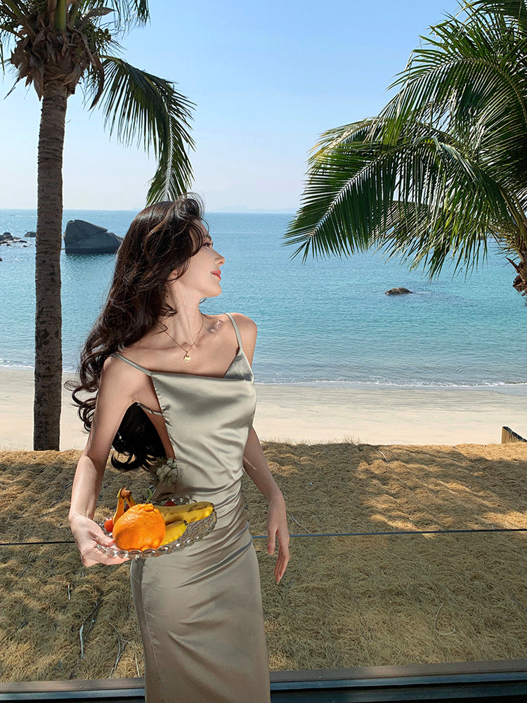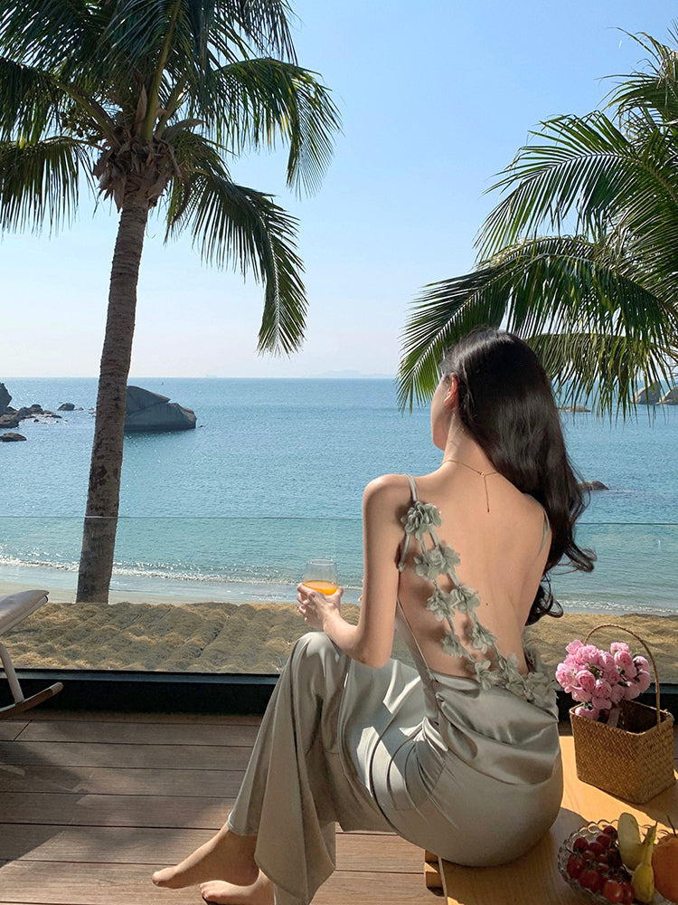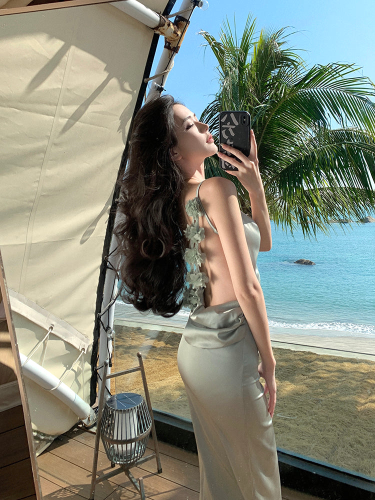 Fascinating Spaghetti Strap Backless Evening Maxi Dress Simple Sheath Ruched Neckline 3D Floral Long Dress AP3462
