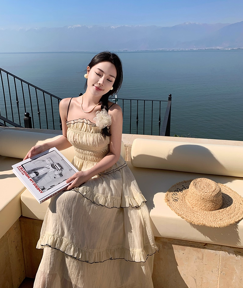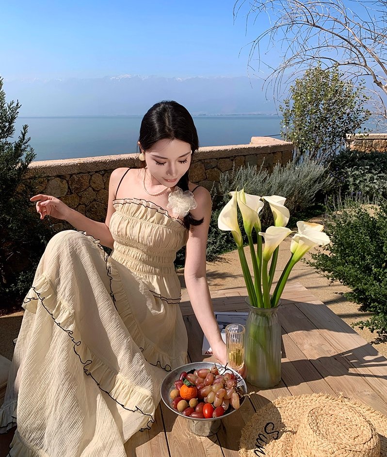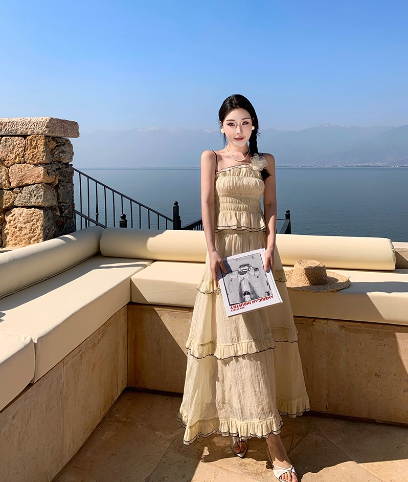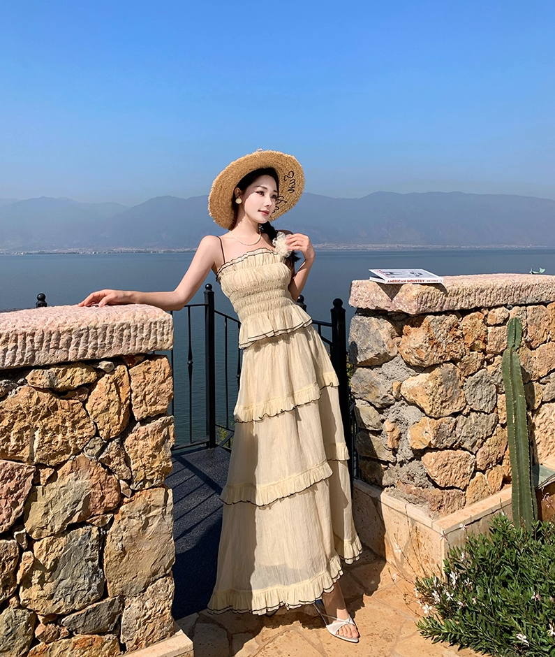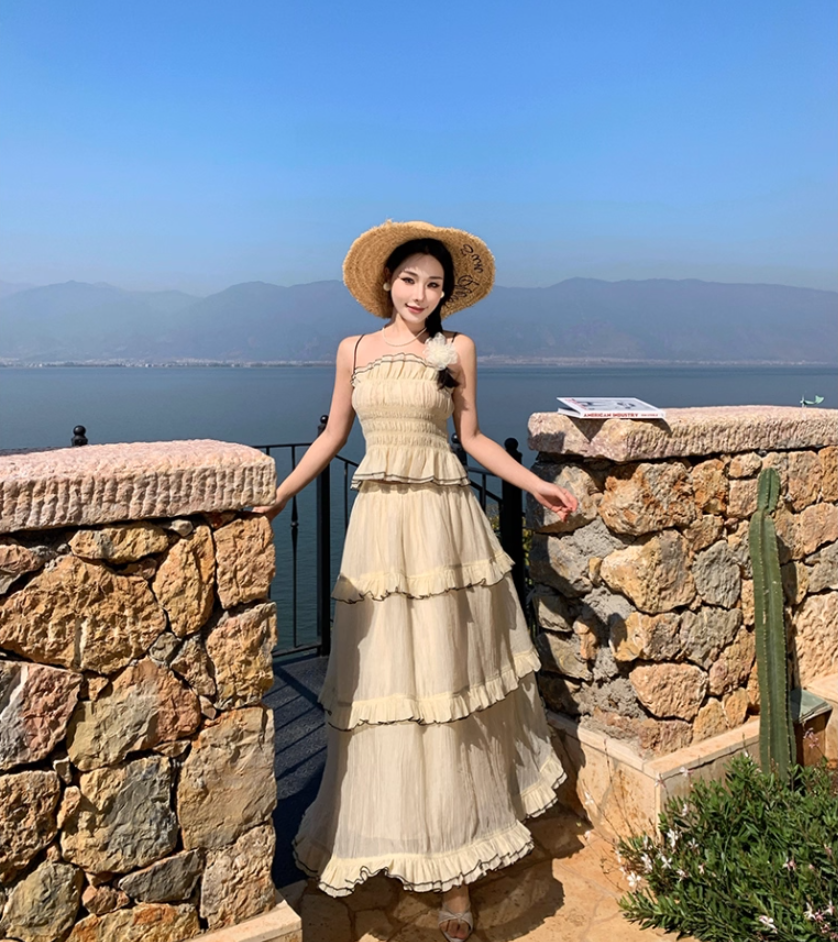 Flowy 2-Piece Set Spaghetti Strap Ruffles Maxi Dress French-Style A-Line Tiered Waist-Cinching Long Dress AP3429
