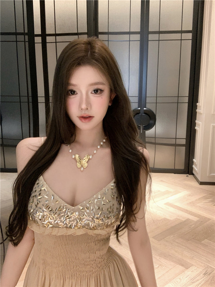 Unique Spaghetti Strap Ruffles Trim Maxi Dress Romantic A-Line Sequins Cinched-Waist Long Dress AP3503