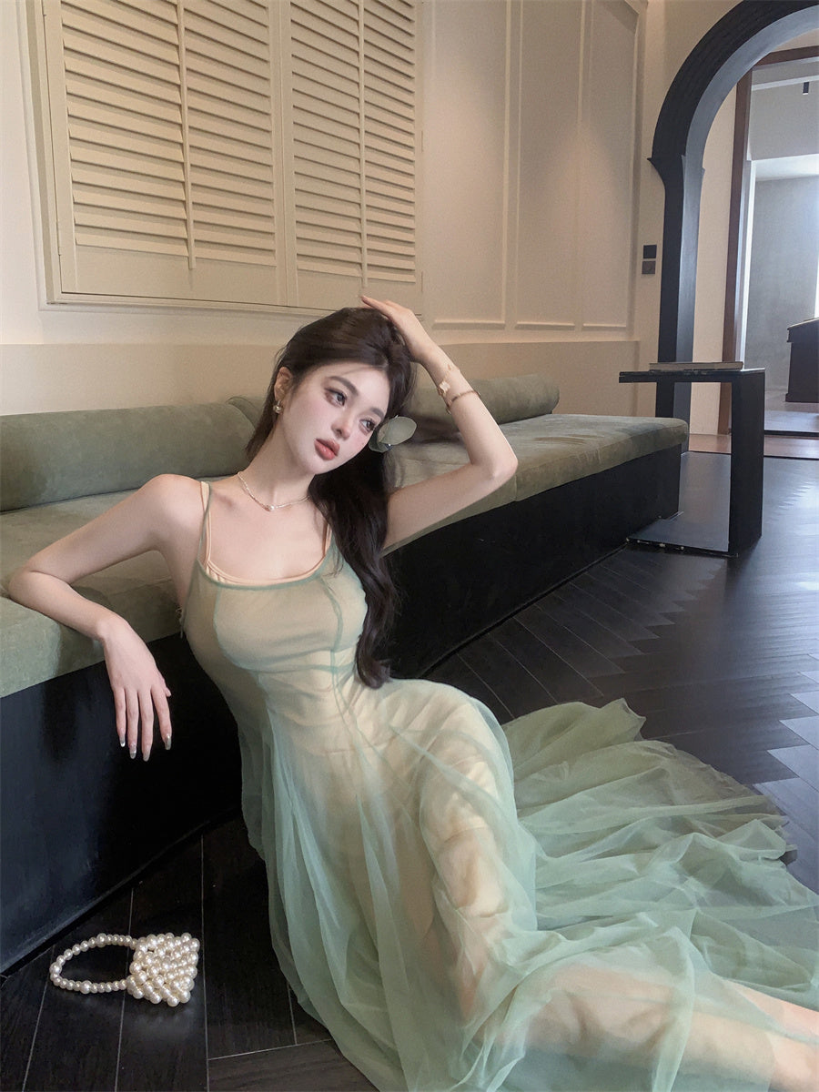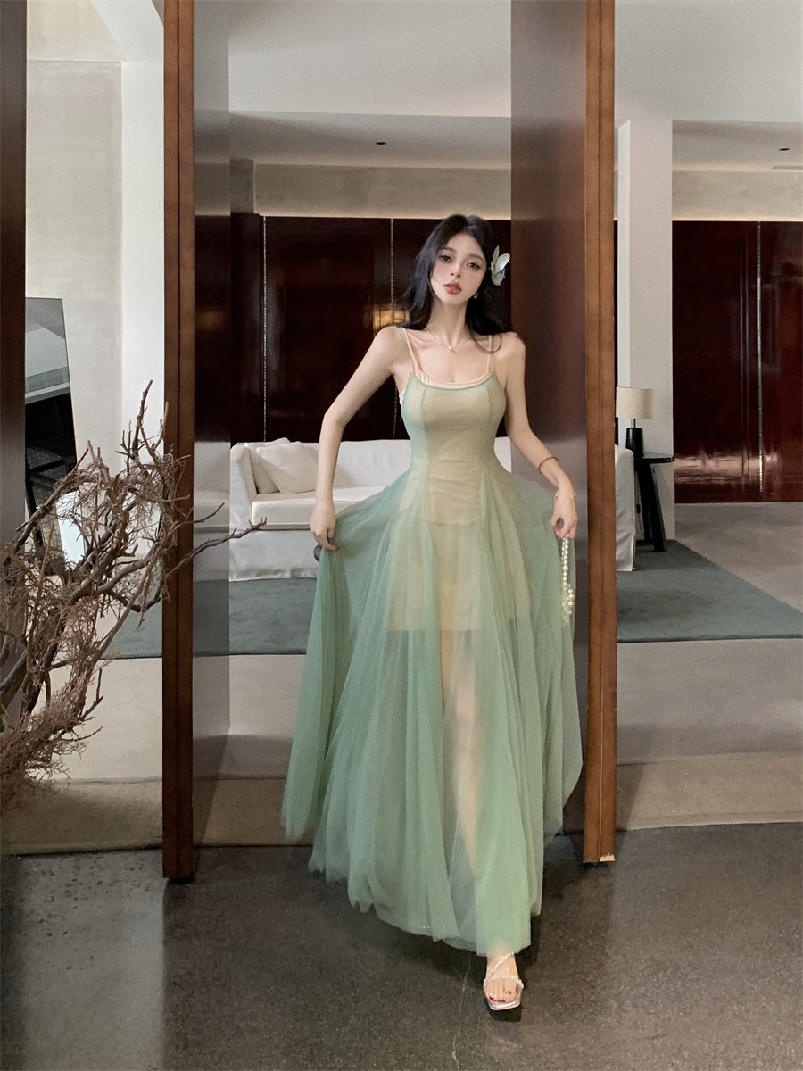 Charming 2-Piece Set Spaghetti Strap Maxi Dress Vintage A-Line Green Tulle Pleated Long Dress AP3499