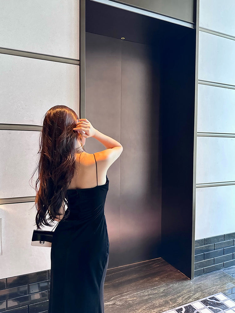 Princess Spaghetti Strap Black Mermaid Maxi Dress Sexy Velvet Sequins Accent Evening Long Dress AP3484