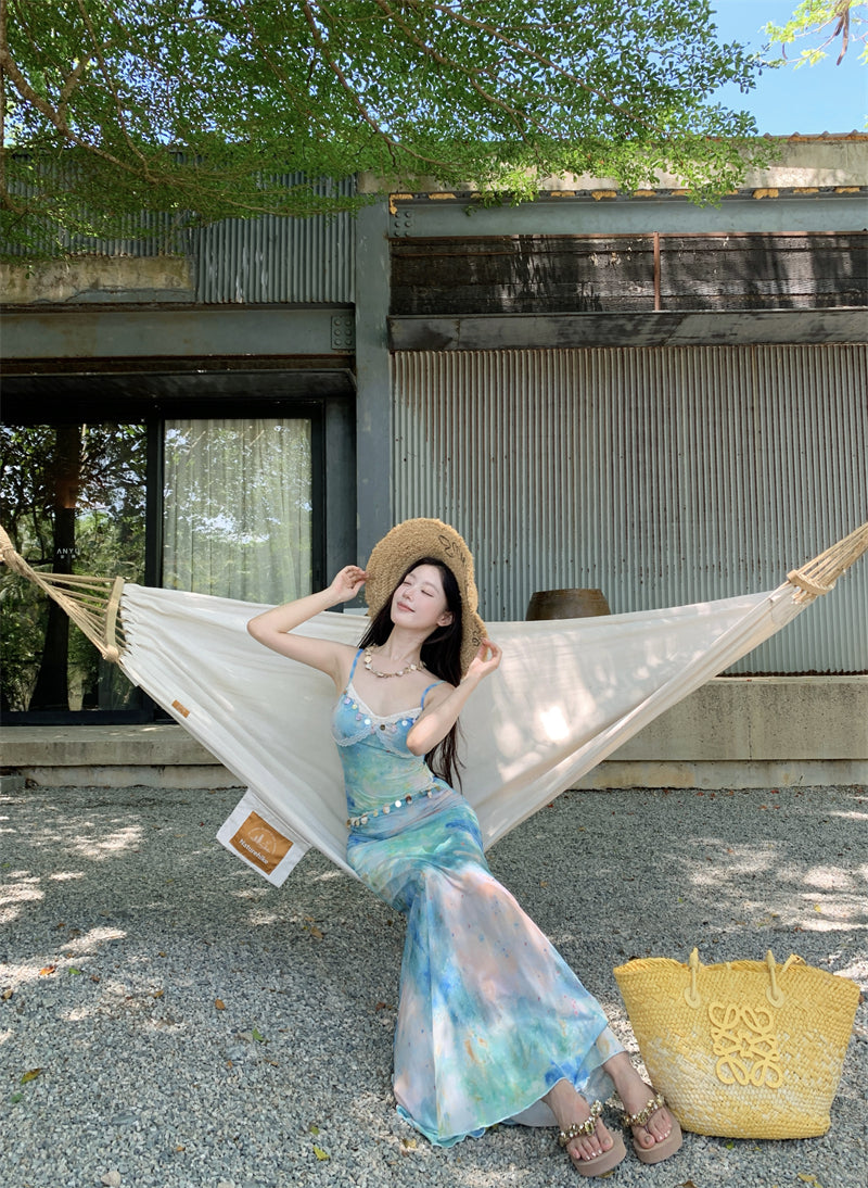 Classical Spaghetti Strap Sheath Maxi Dress Sexy Vacation Outfit Lace Trimmed Tie-Dye Long Dress AP3342