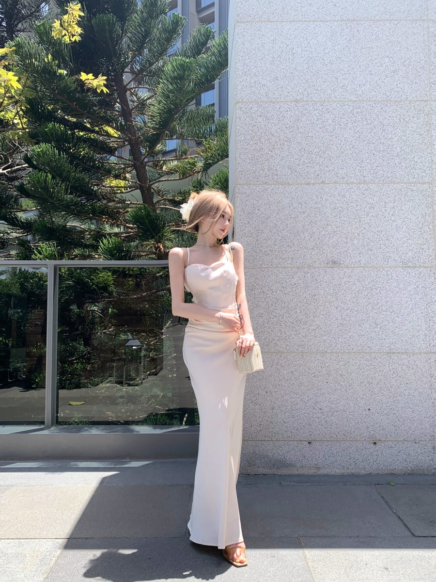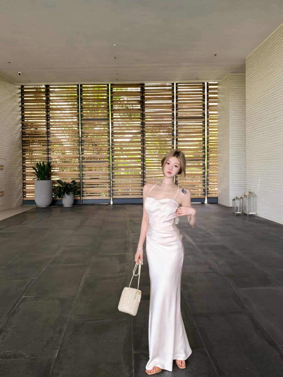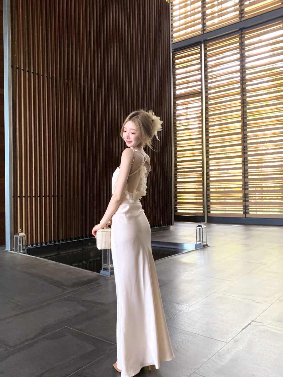 Sweet Spaghetti Strap Sheath Crisscross Back Maxi Dress Trendy 3D Floral Trimmed Sheen Fabric Long Dress AP3344