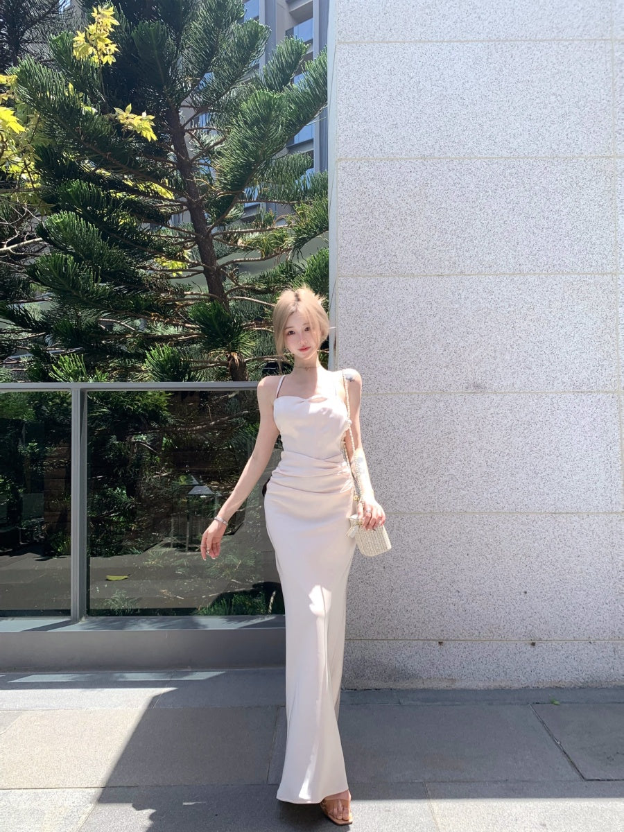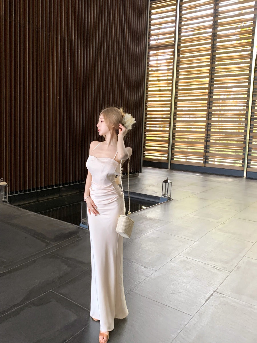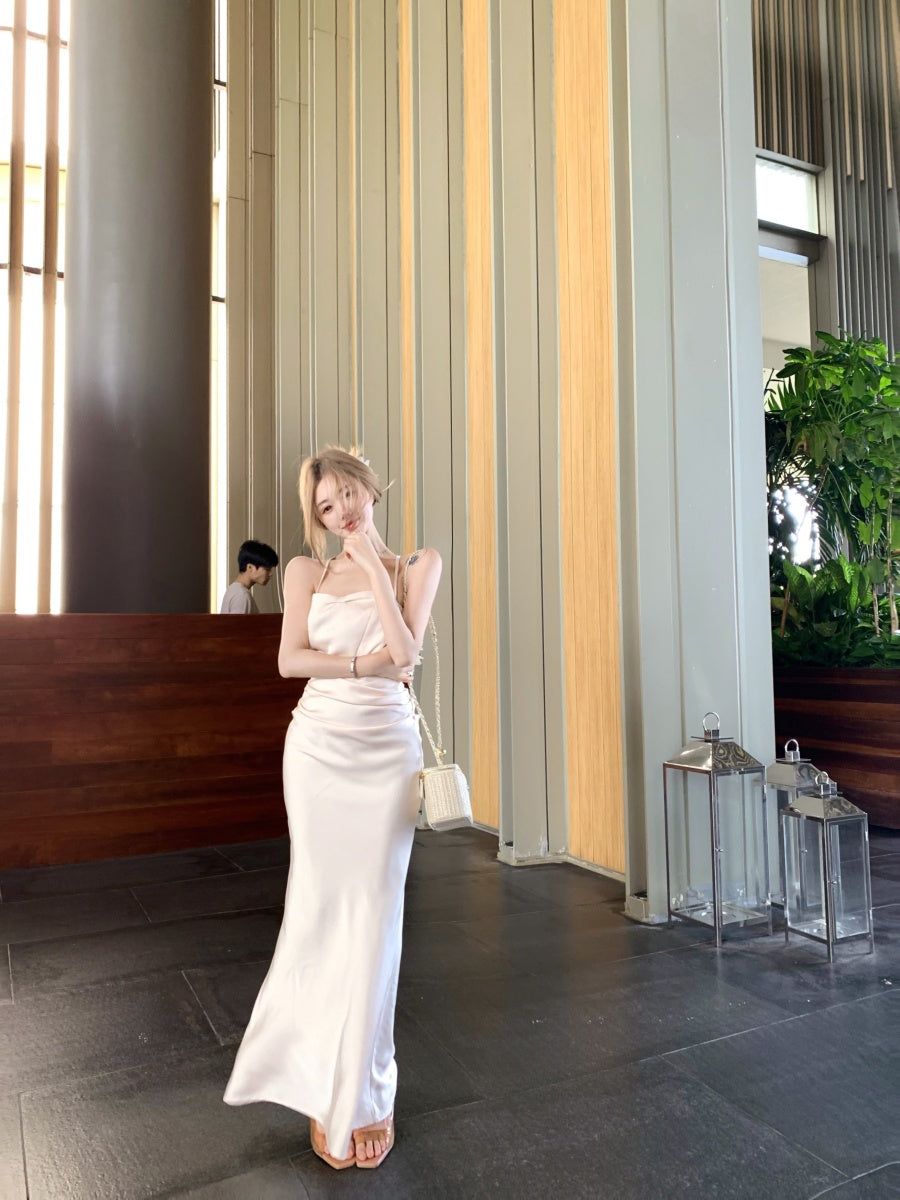 Sweet Spaghetti Strap Sheath Crisscross Back Maxi Dress Trendy 3D Floral Trimmed Sheen Fabric Long Dress AP3344