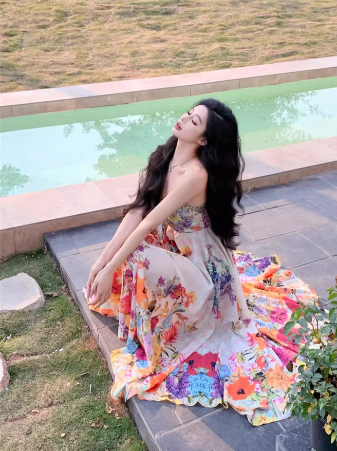 New Tendency Spaghetti Straps Maxi Dress Romantic A-Line Floral Print Sequins Design Long Dress AP3544