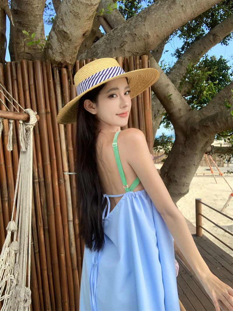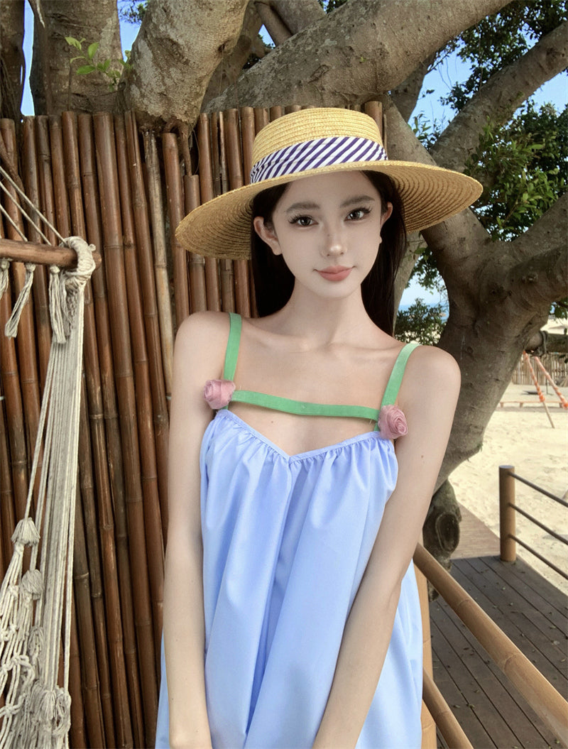 Pretty Spaghetti Straps Lace Hem Maxi Dress Fancy A-Line 3D Floral Design Loose Fit Blue Long Dress AP3553