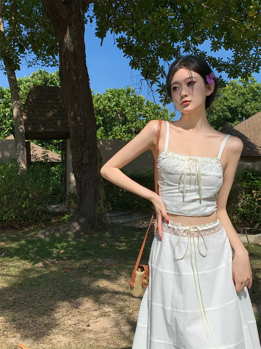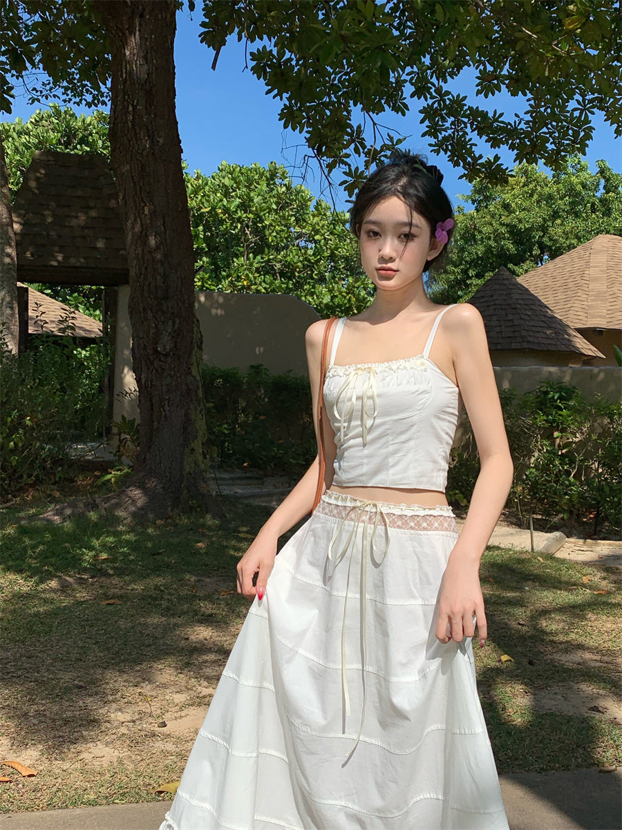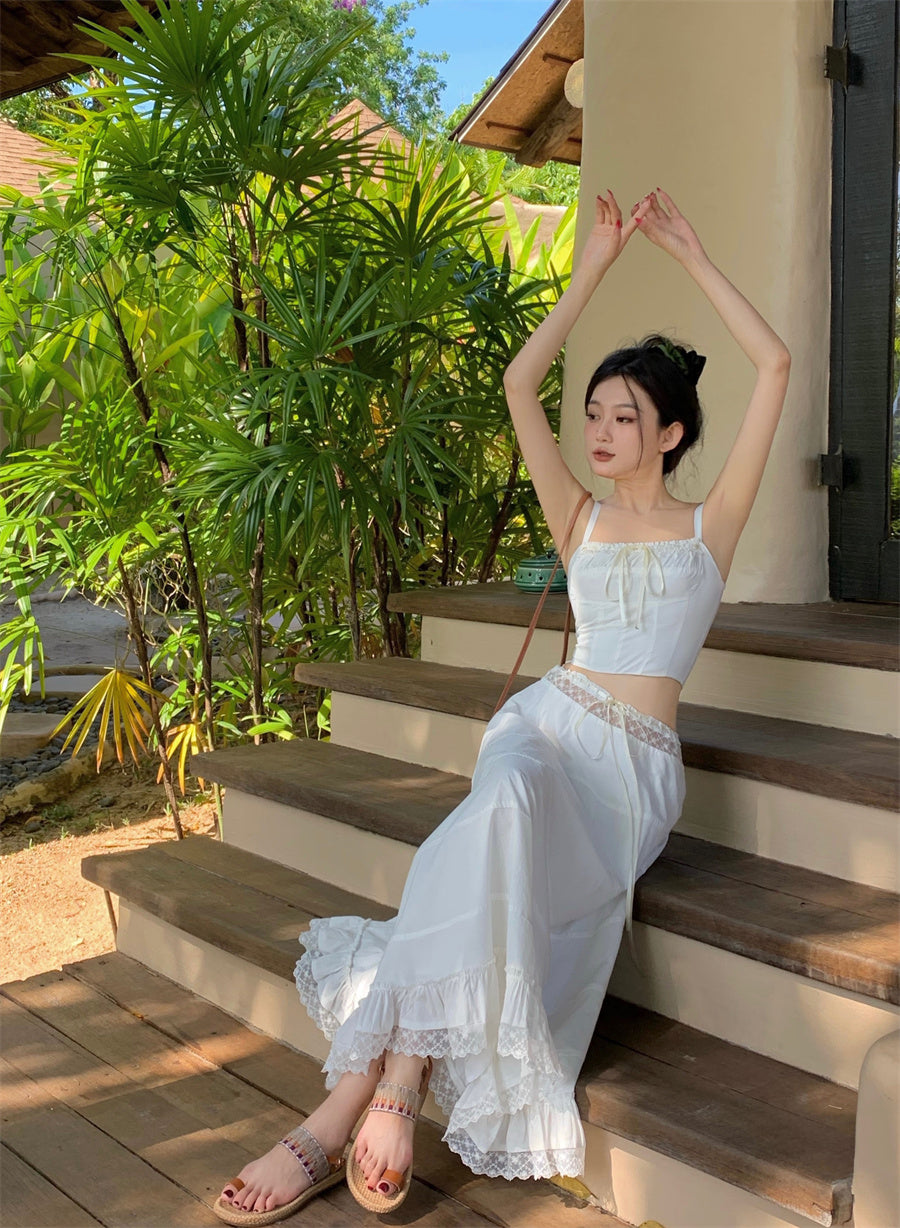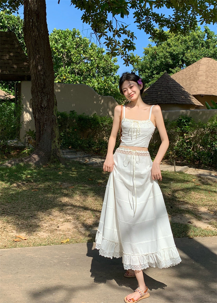 Dreamy 2-Piece Set A-Line White Maxi Dress Graceful Spaghetti Straps Cinched Bodice Lace Trim Long Dress AP3583