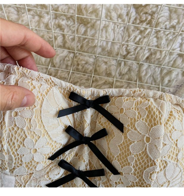 New Fashion Palace Style Temperament Women Lotus Leaf Waist Lace Square Collar Sweet Bowknot Puff Sleeve Crop Bustier Top Blouse AP000194
