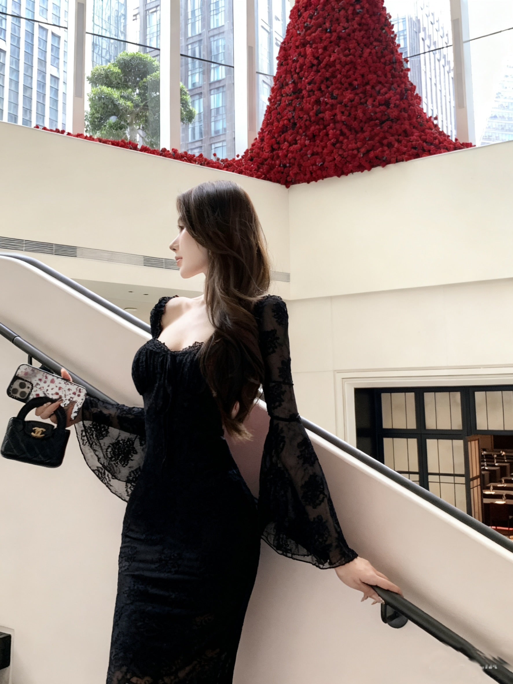 Fantastic Black Lace Long Bell Sleeve Maxi Dress French Style Square Neck Mermaid Evening Long Dress AP3824