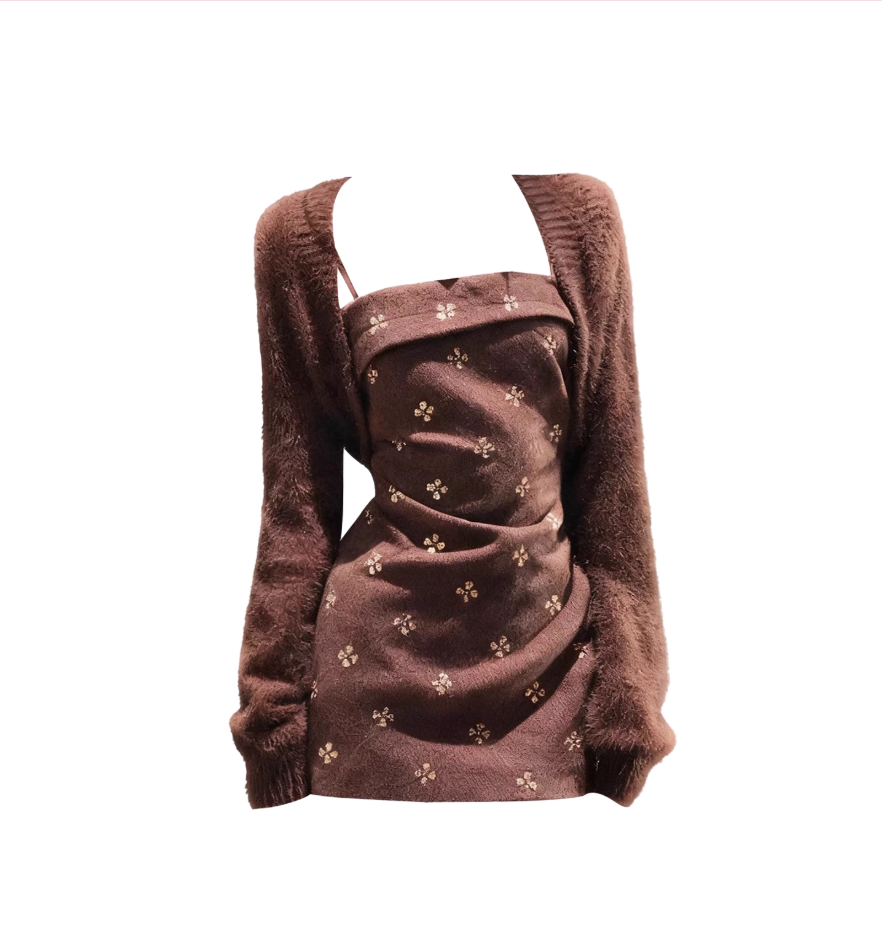Dreamy Sheath Square Neck Mini Skirt Hottie 2-Piece Set Long Sleeve Cardigan Floral Short Dress AP4098