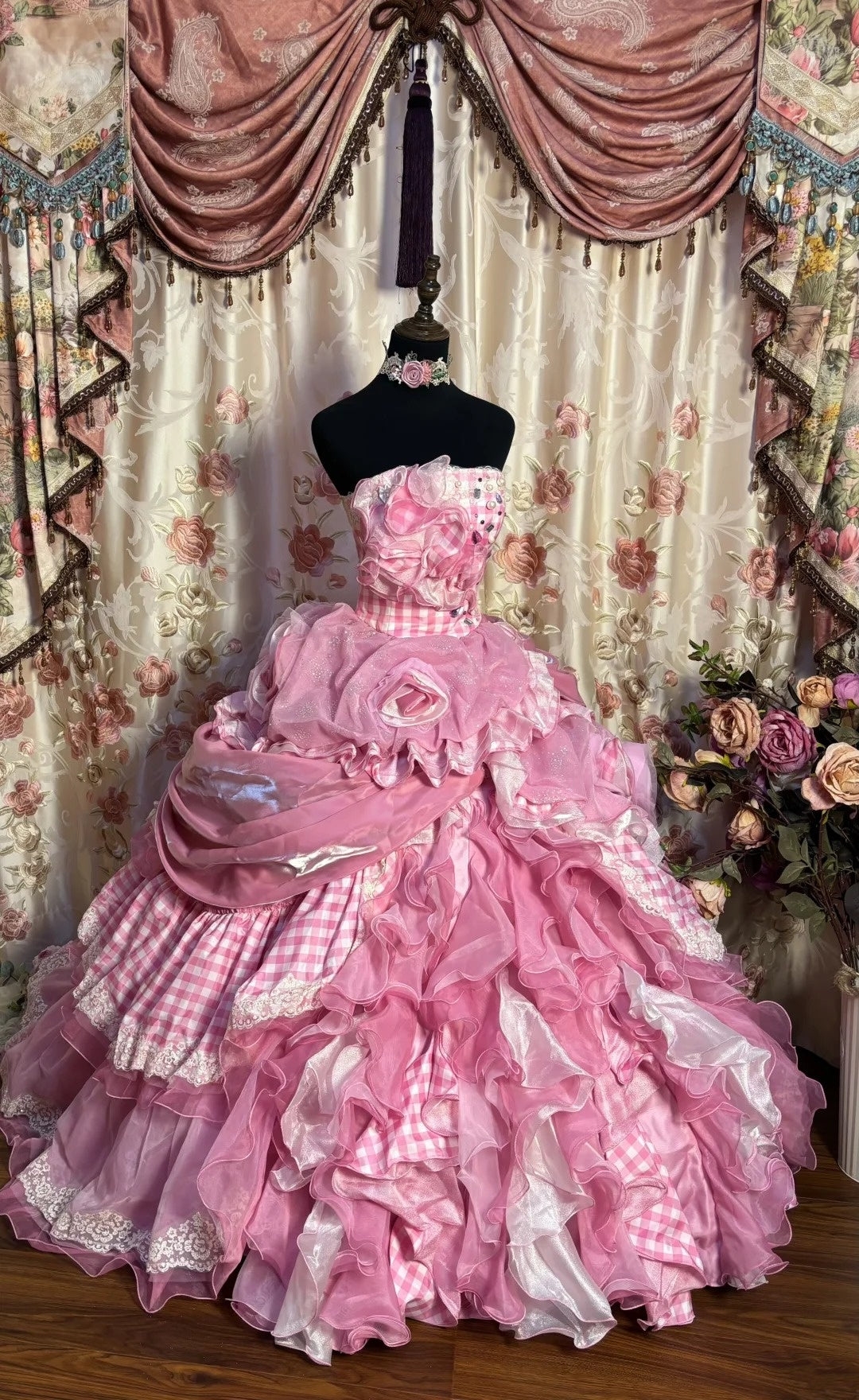 New Pink Plaid Strapless A-Line Evening Gowns Handmade Flowers Sequins Crystals Prom Dress AP2697