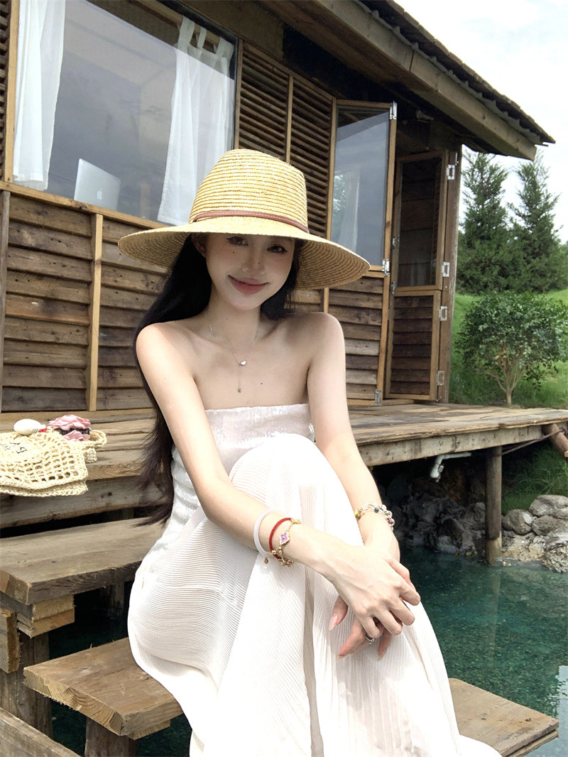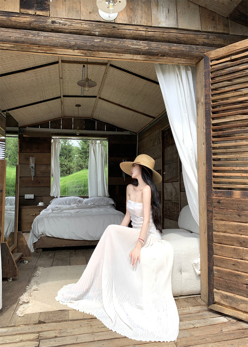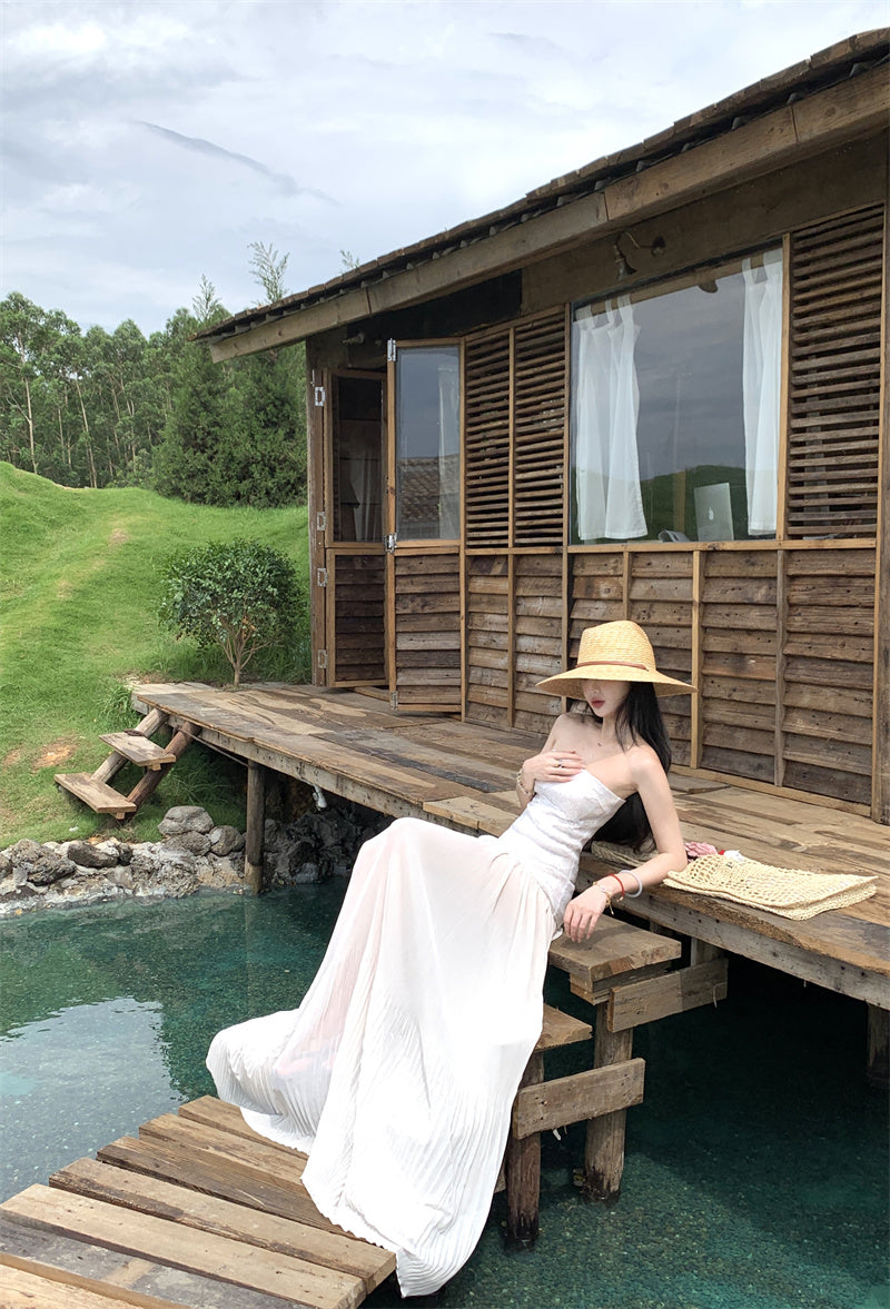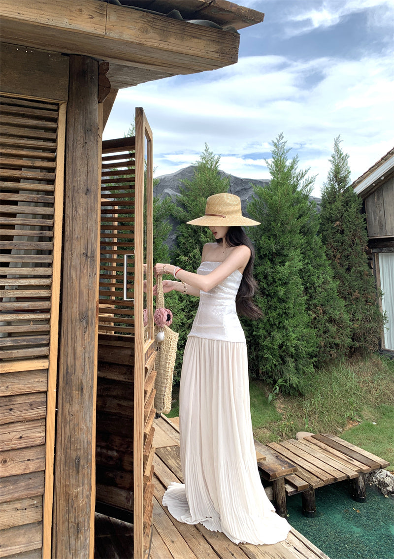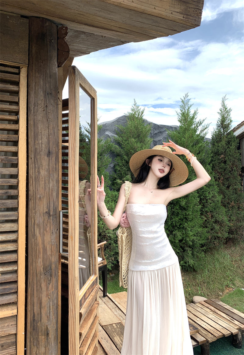 Sheen Strapless A-Line White Maxi Dresses Glittering Sequins Splicing Tulle Long Dress AP3352