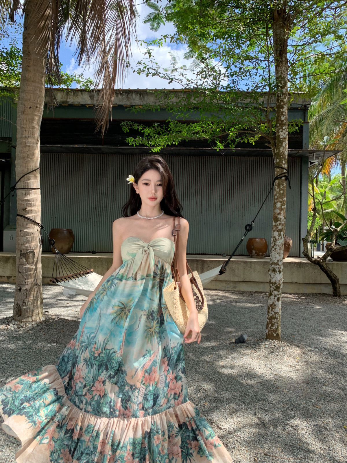 Amazing Strapless Floral Print Backless Maxi Dresses Vibrant Knot Front A-Line Ruffles Hem Long Dress AP3534
