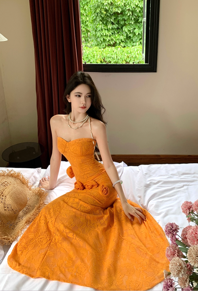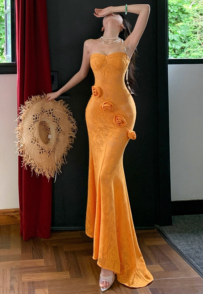 Cute Strapless Mermaid 3D Flowers Maxi Dresses Flattering Textured Fabric Asymmetric Hem Long Dress AP3345