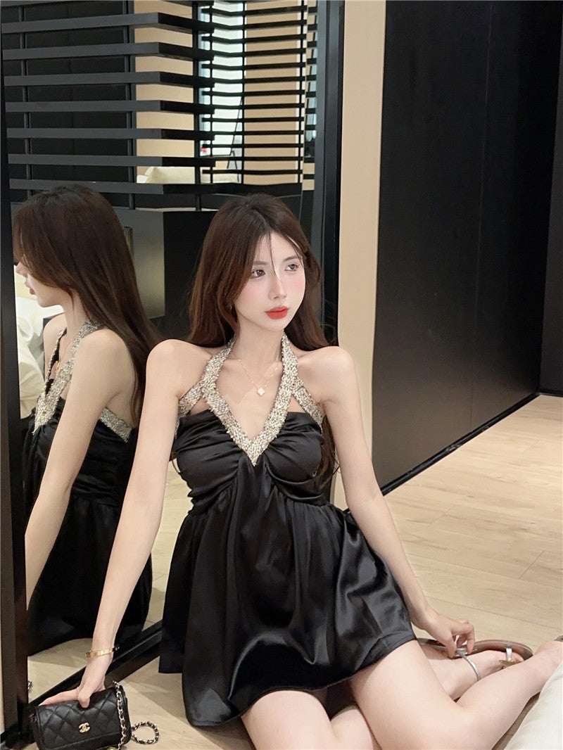 Soft Fabric Hollow-Out Party Skirt Sleeveless Crystal Ornament Halter Short Dress AP0478