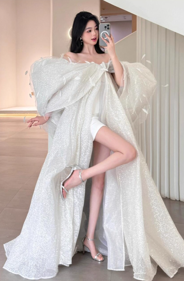 Exaggerated Sleeve Off-Shoulder Petal Detailing Gala Dress Glitter Fabric High-Slit Prom Dress AP0864