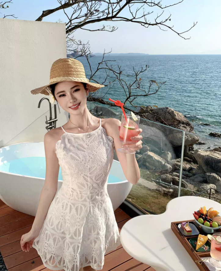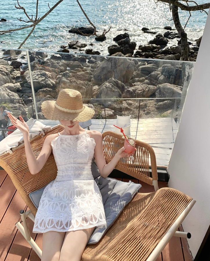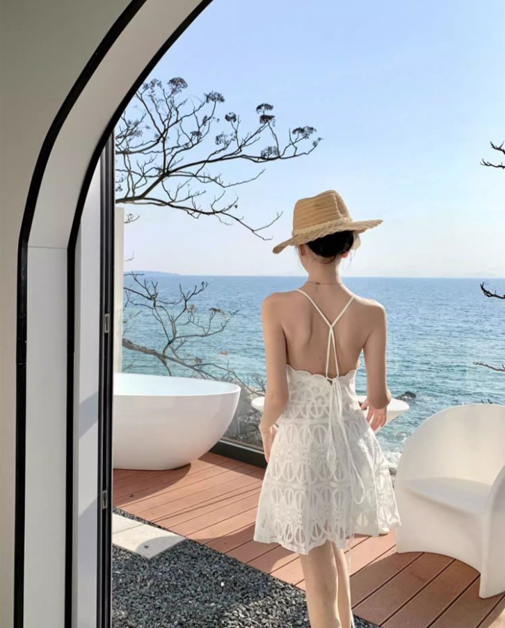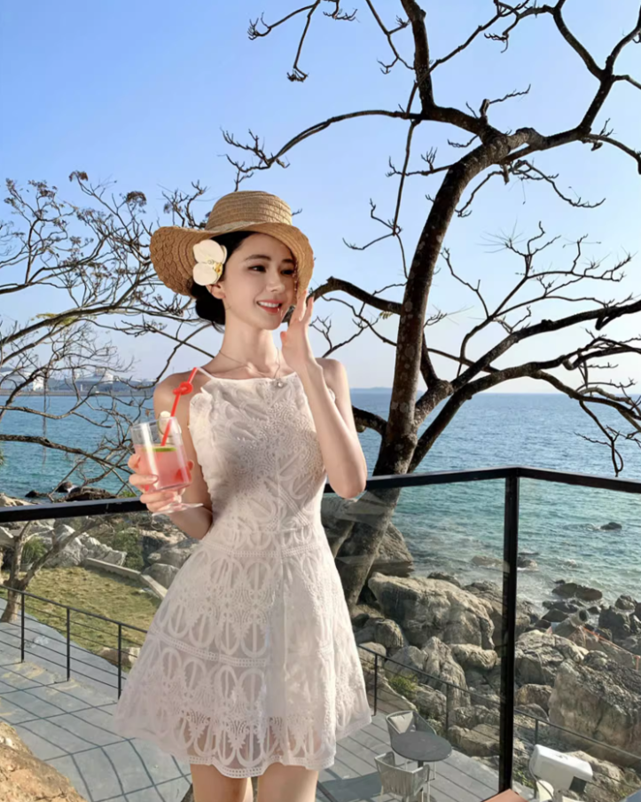 Summer Coastal Getaways Hollow-Out Tulle Overlay Mini Skirt Elegant Double Layers A-Line Halter Short Dress AP1379
