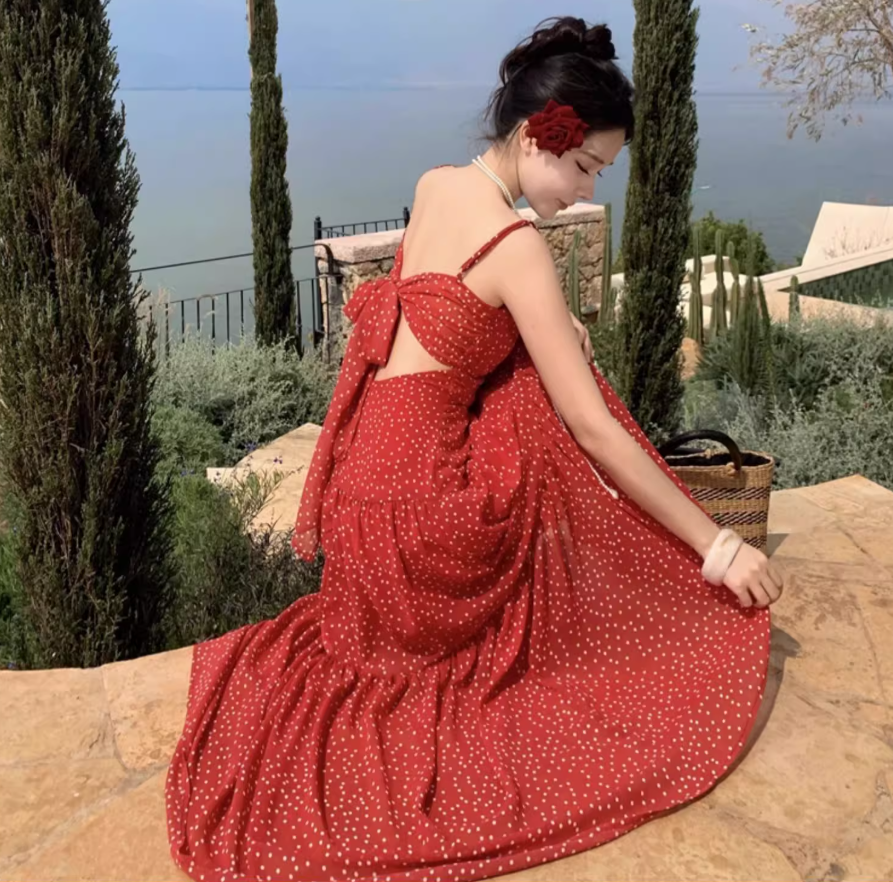 Fashionable Dot Print Red Backless Beach Elegant Sundress Spaghetti Strap Vacation Long Dress AP0413