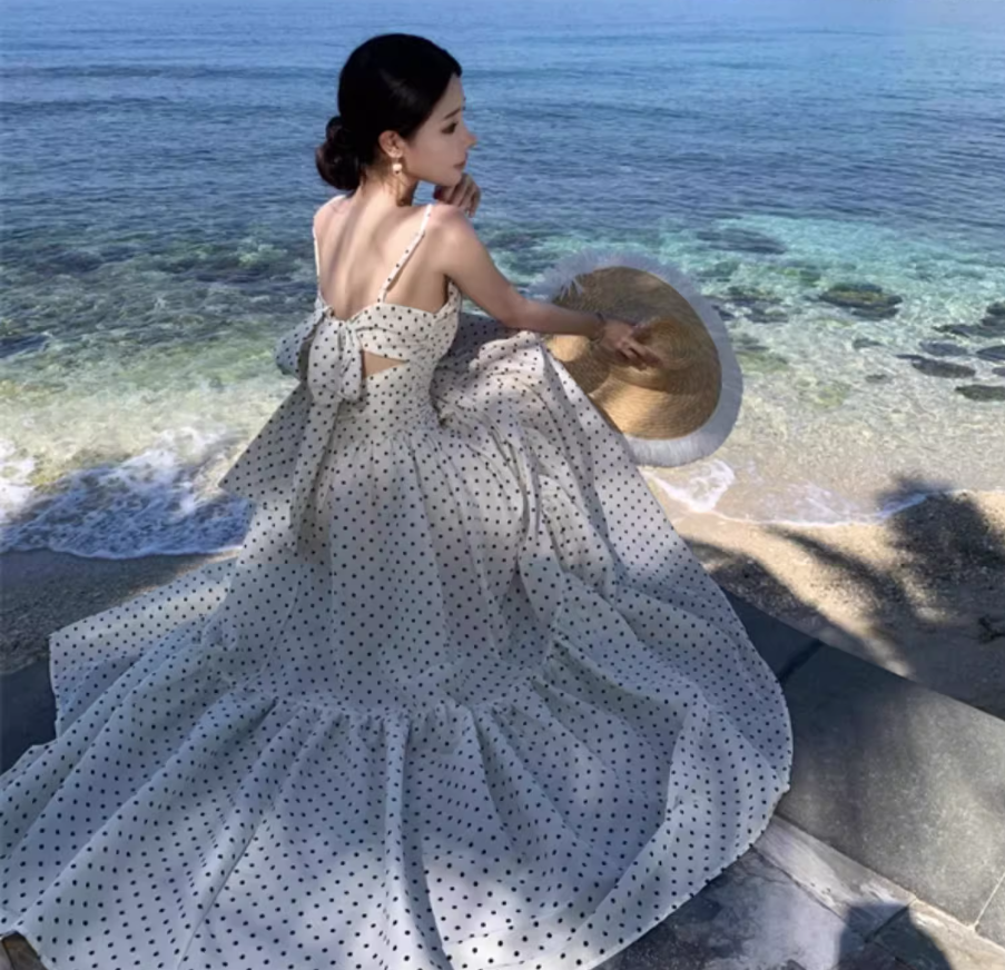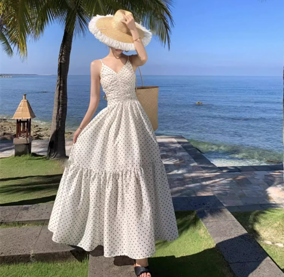 Summer Vacation Dot Print Loose Fit Flowy Dress Spaghetti Strap Long Dress AP0352
