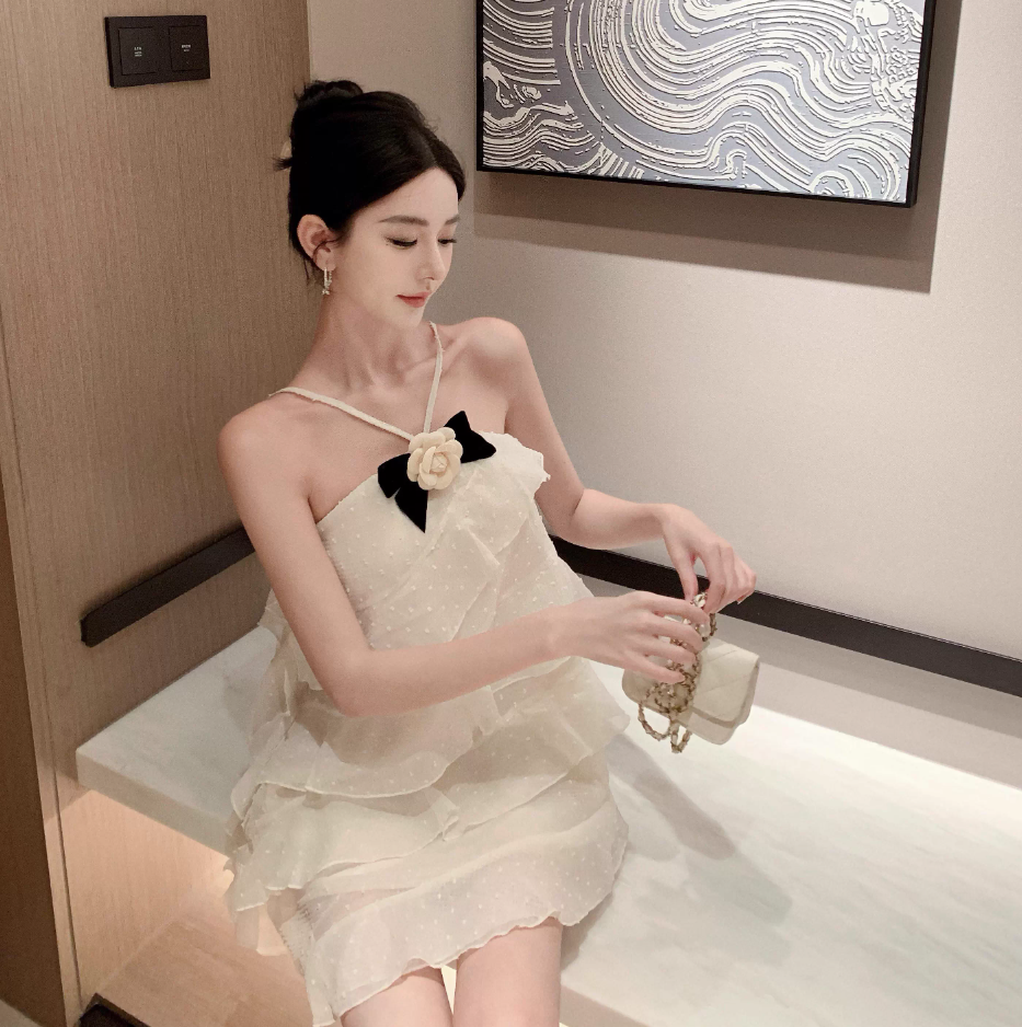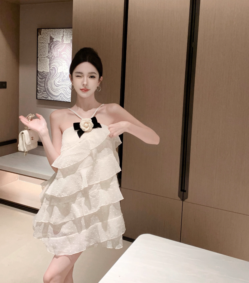 Cute Ivory Tiered Birthday Party Mini Skirt Spaghetti Strap Flower Ornament Flowy Short Dress AP1213