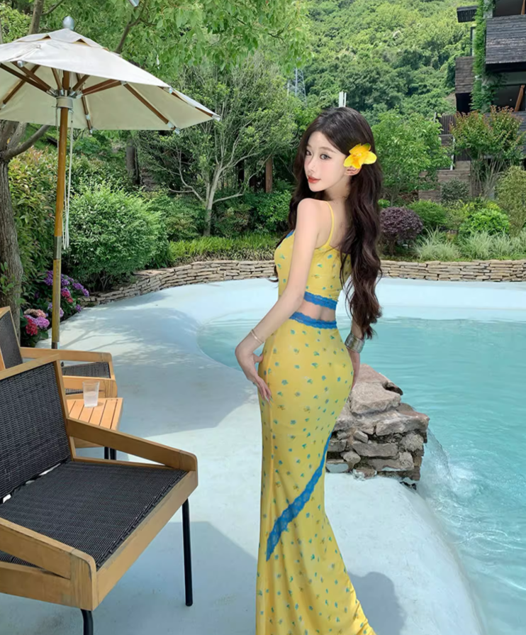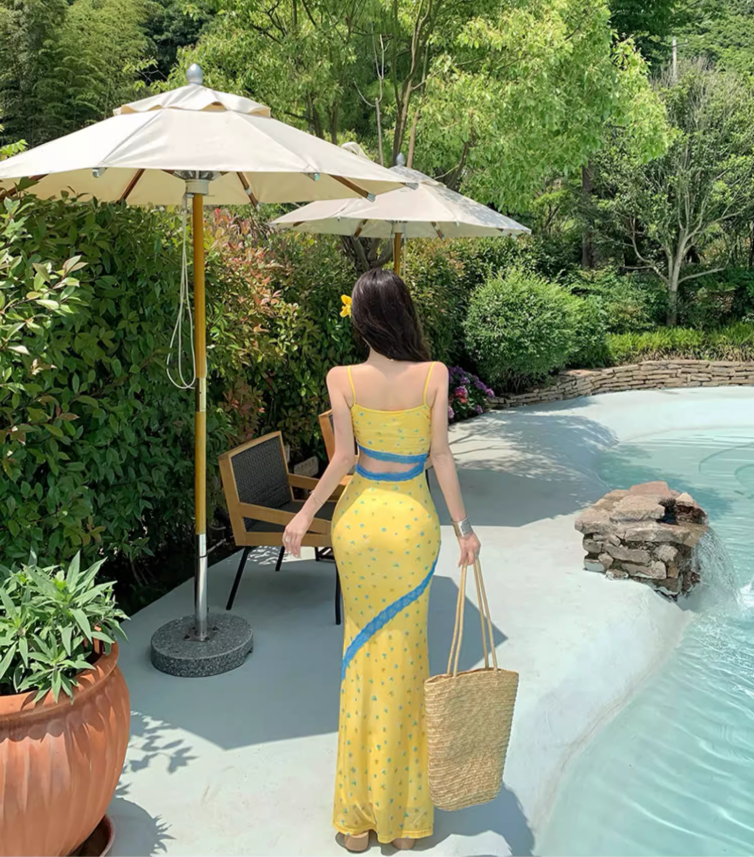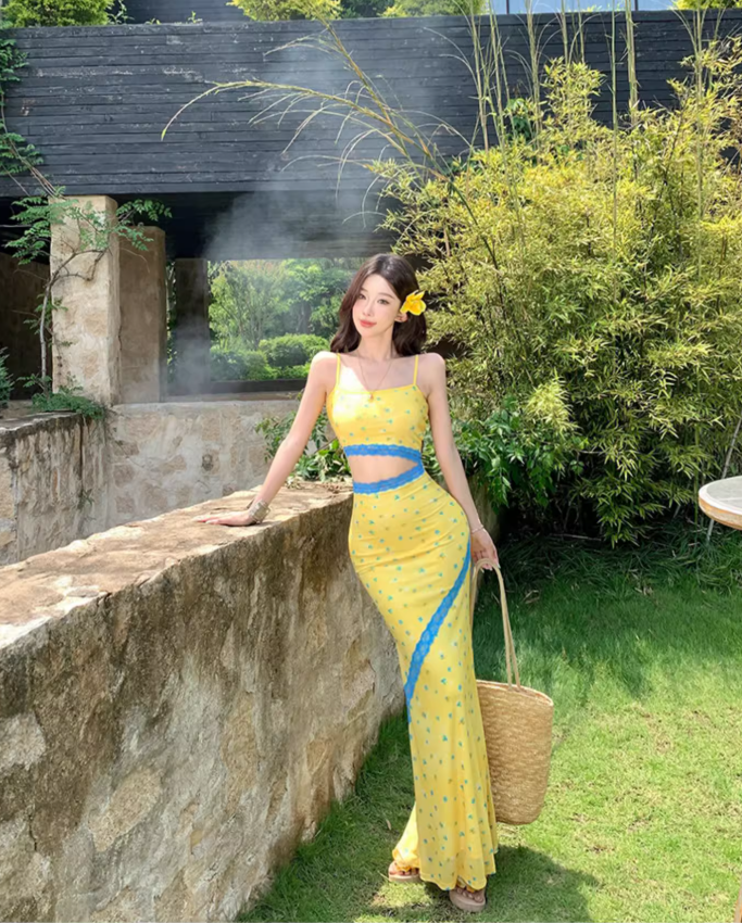 Lace Trimmed Open-Waist Fitting Maxi Dress Spaghetti Strap Vibrant Bodycon Long Dress AP0600