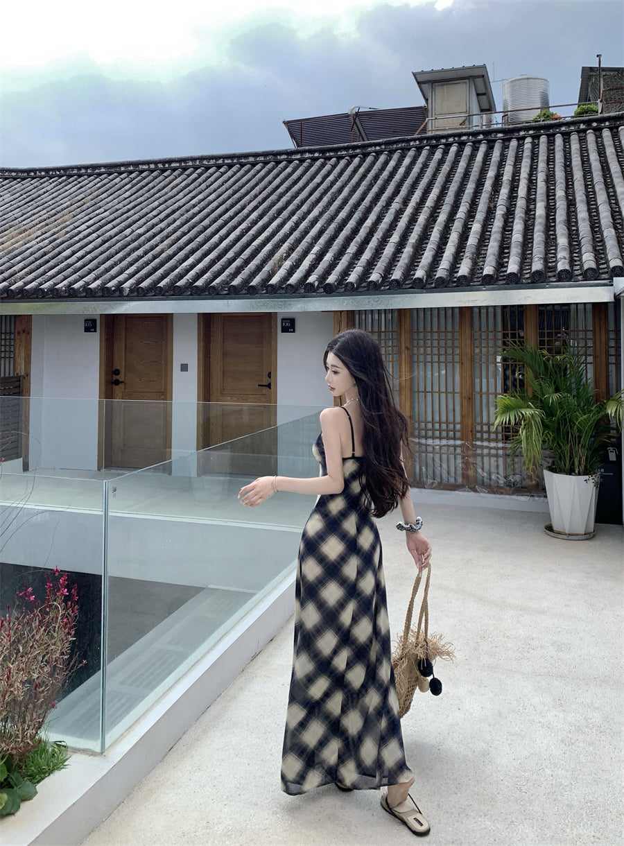 Adorable Plaid V-Neck Maxi Dress Boho-Style A-Line Bow Accent Waist-Cinching Long Dress AP3428