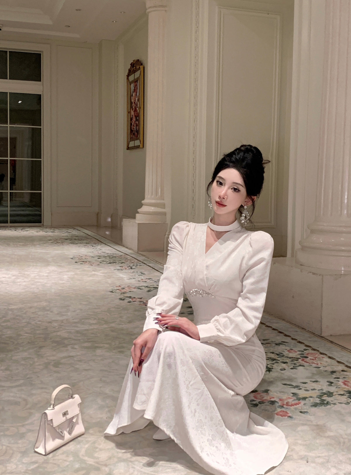 Romantic V Neck Long Sleeve White Evening Maxi Dress Dreamy Crystals Accent Mermaid Long Dress AP3749