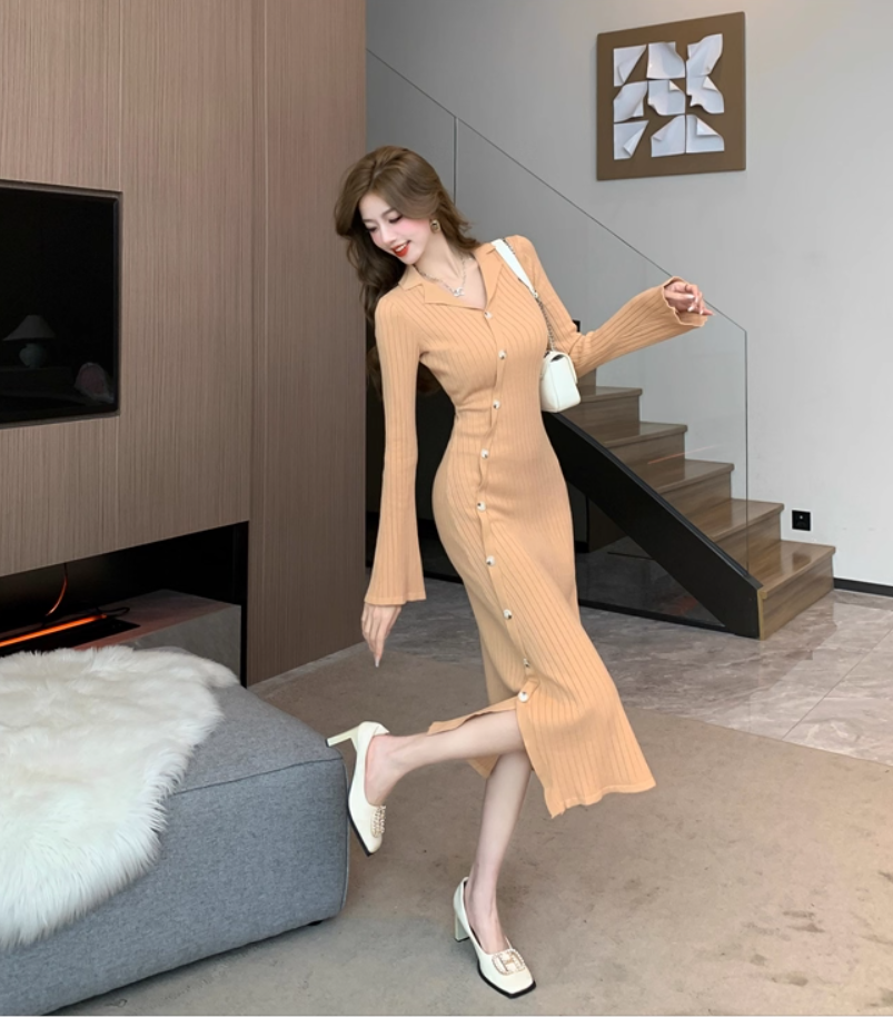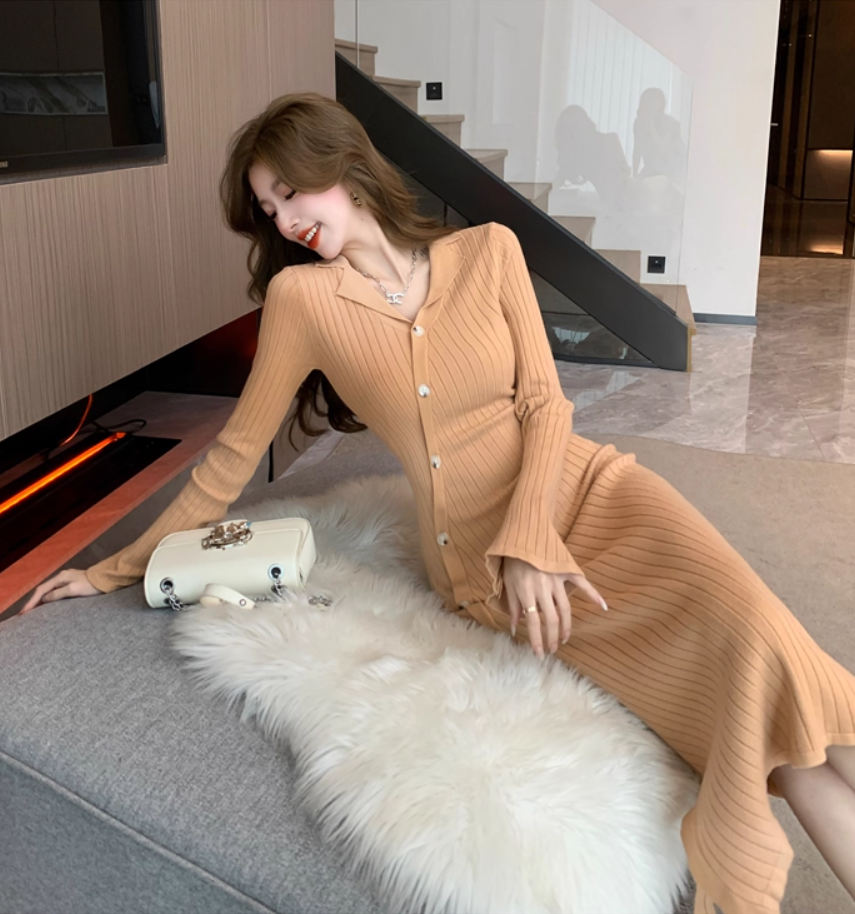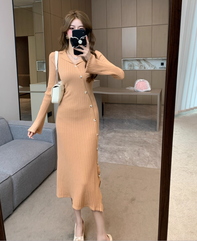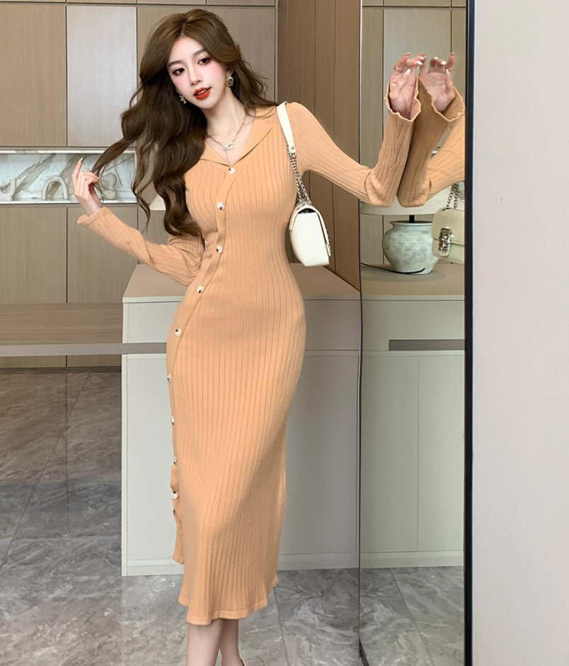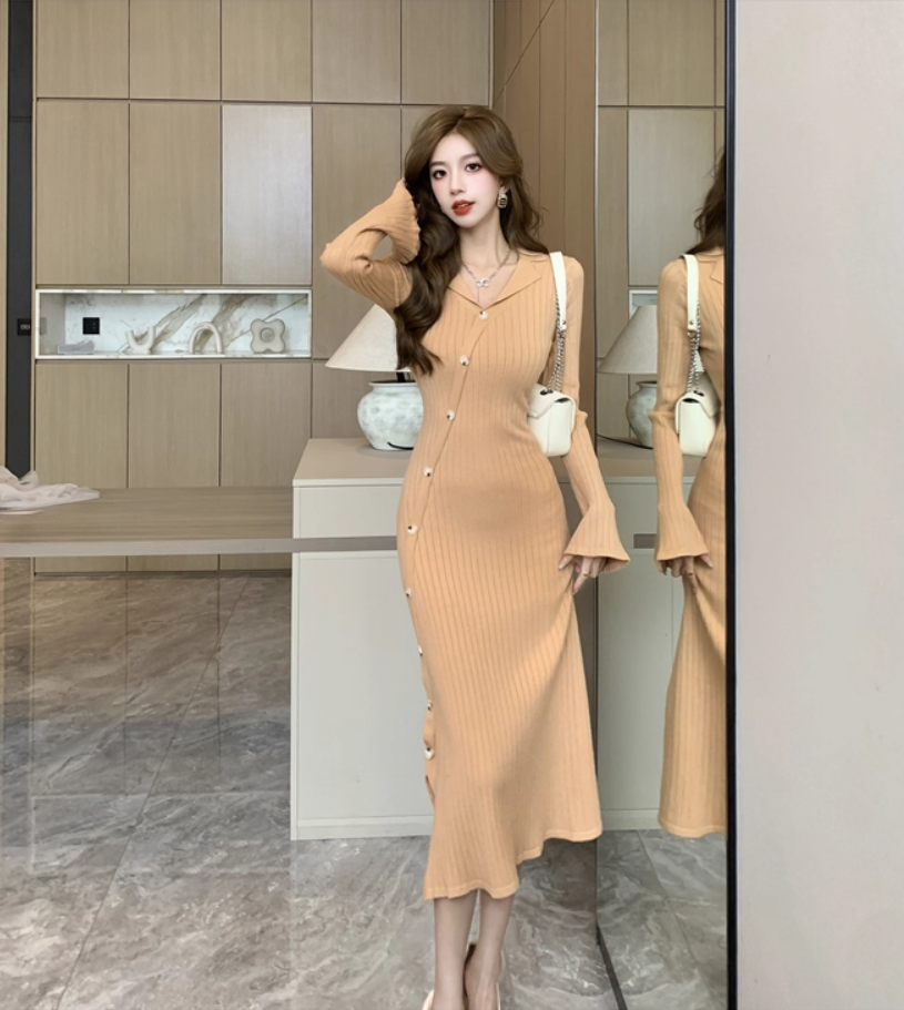 Fashionable V Neck Fitted Long Sleeve Midi Dress Gorgeous Sheath Knitted Evening Long Dress AP3773