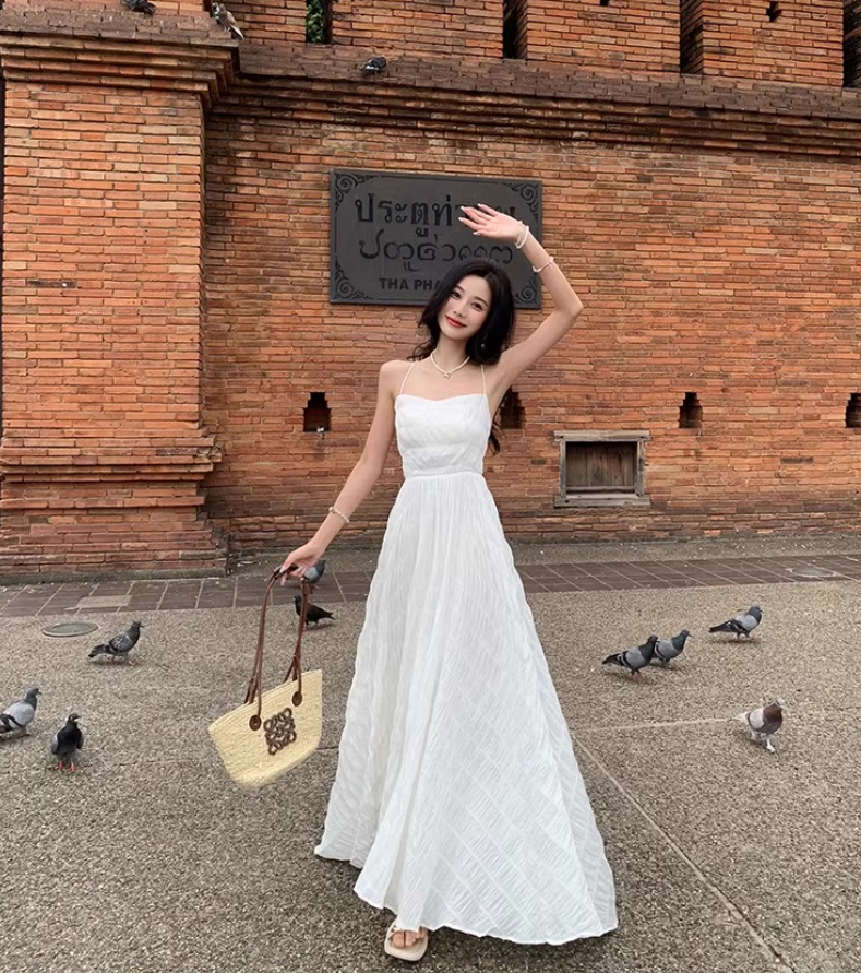 Elegant Waist-Cinching Vacation Outfit Maxi Dress Open-Back Tie-Back Halter Long Dress AP0580