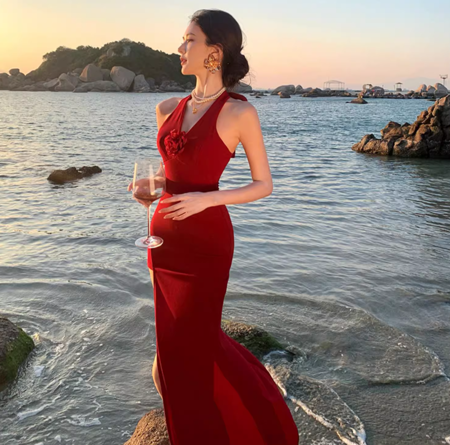 High-Slit Vacation Flowy Beach Dress Vibrant Waist-Cinching Sleeveless Halter Dress AP0448