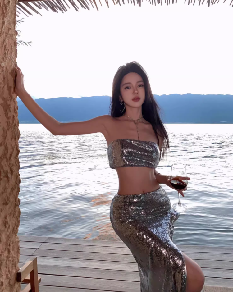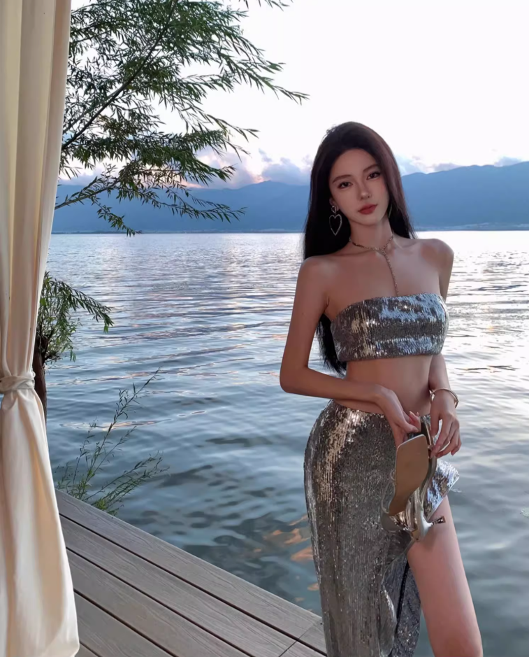 Y2K Sexy Silver Sequins Design Party Mermaid Maxi Dress Chic Two-Piece High-Slit Long Dress AP1231