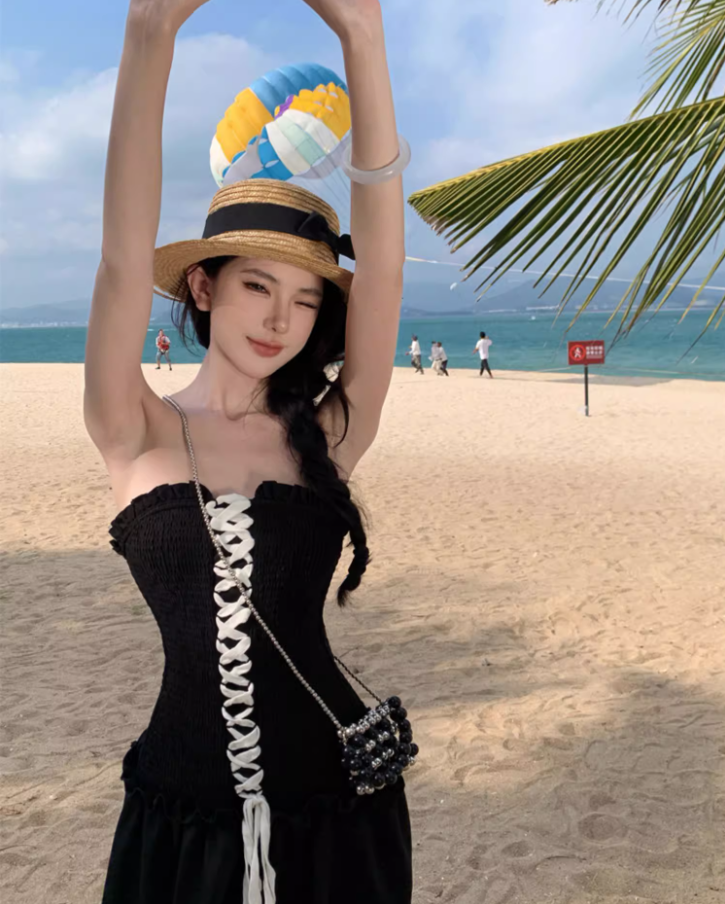 Vogue Lace-Up Corset Ruffles Trimmed Maxi Dress Elegant Stylish Shoots Strapless Long Dress AP1493