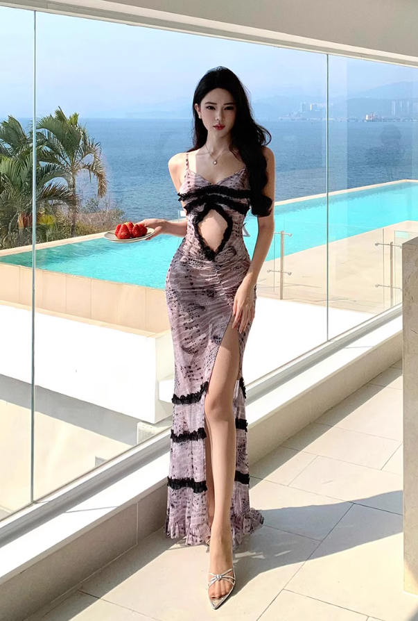 Alluring Snake Print Cutout Maxi Dress Y2K Beach Core Black Ruffles Trim High-Slit Long Dress AP1429