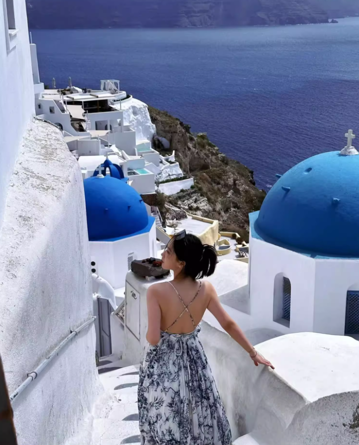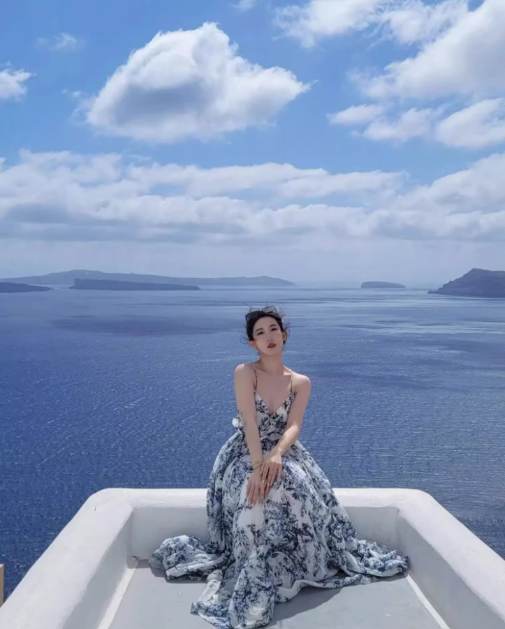 Vintage Island Vacation Blue & White Print Maxi Dress Niche Flowy Spaghetti Strap Waist-Tie Long Dress AP1443