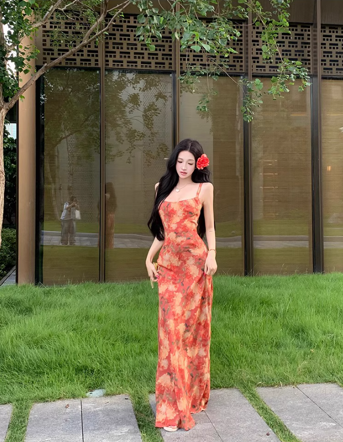 Vintage Colorful Floral Print Maxi Dress Beach Vacays Chic Sheath Spaghetti Strap Open Back Long Dress AP1303