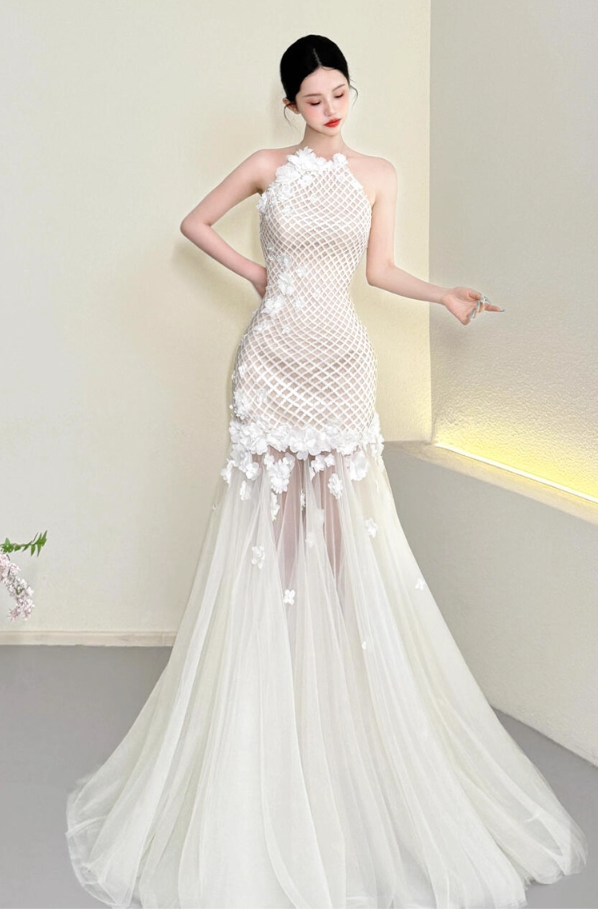 French Floral Print Sheer Tulle Train Maxi Dress Niche Sheath Applique Beading Halter Prom Dress AP0782