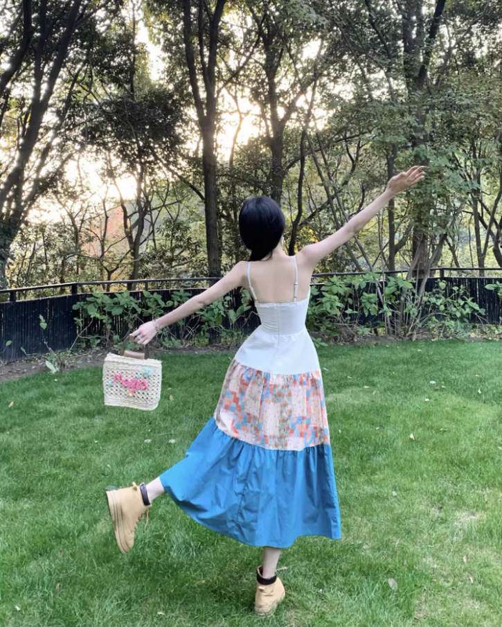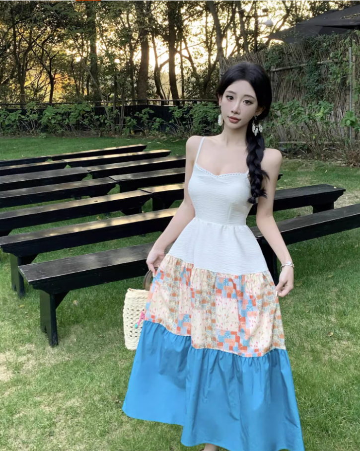 Cottagecore Patchwork Spaghetti Strap Maxi Dress Nature-Inspired Trips Tiered Color-Block Long Dress AP1608