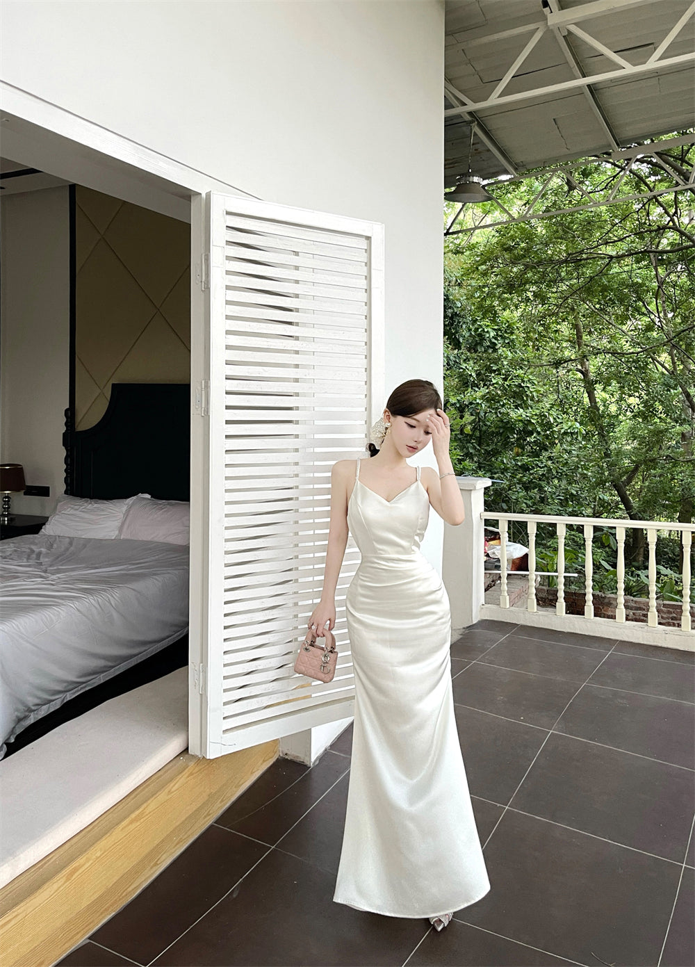 Vogue Ivory Satin Deep V Neck Mermaid Maxi Dress French Style Spaghetti Straps Sheen Fabric Long Dress AP2083