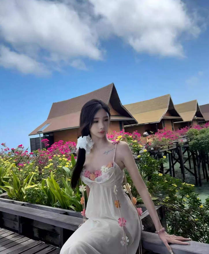 Dreamy 3D Floral Design Spaghetti Strap Maxi Dress Chic Nature Shoots Ruched Flowy Long Dress AP1391
