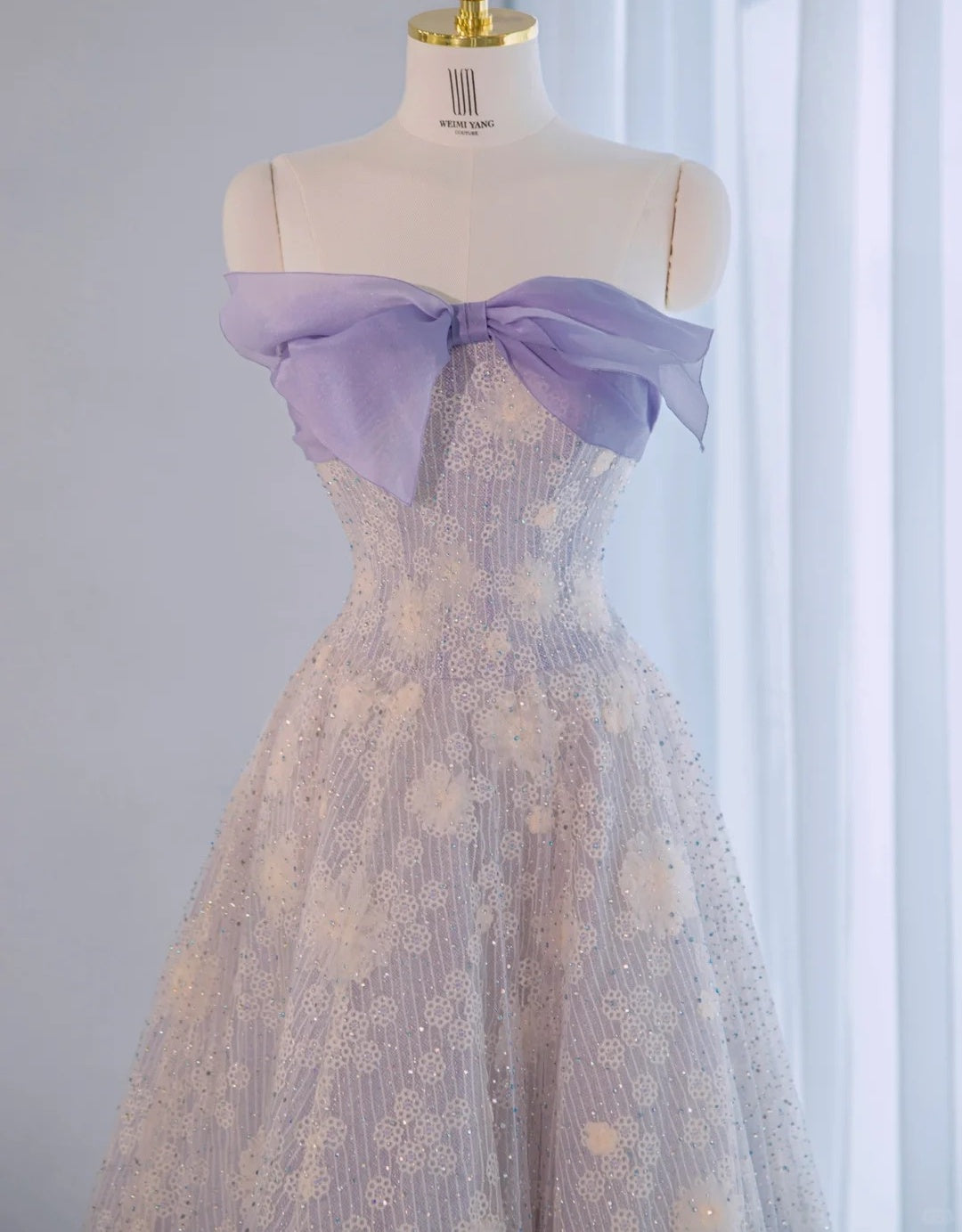 Dreamy Applique Strapless Sheer Mesh Overlay Big Bow Trim Maxi Dress Graceful A-Line Sequins Accent Formal Events Prom Dress AP2151