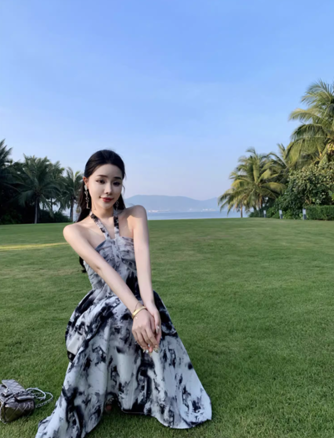 Classical Tie-Dye Flowy Maxi Dress Chic Backless Coastal Trips Loose Fit Halter Long Dress AP1446